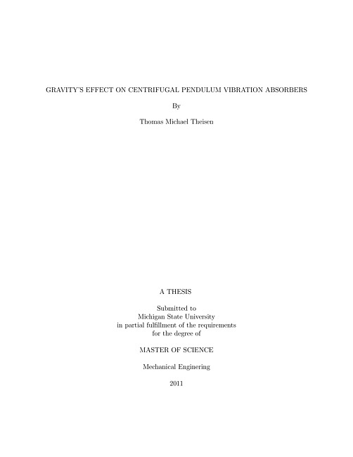 This work describes an analytical investigation of the eects of gravity on the dynamics and performance of centrifugal pendulum vibration absorbers (CPVAs). CPVAs are passive devices, consisting of movable masses suspended on a rotor, which act to reduce torsional vibrations in internal combustion engines and other rotating systems. When the system axis of rotation is not vertical, gravity acts directly on the absorbers, and can aect system behavior at low rotor speeds. The investigation is based on a mathematical model that is studied using perturbation methods and numerical simulations. The eects of gravity are captured by a parameter , and are examined for dierent absorber designs and operatingconditions, paying particular attention to cases relevant to internal combustion engines. It is found that the steady state system response can be divided into two cases, depending on the order n of the applied torque that leads to torsional vibrations. In the general case, n not equal 1 or 2, the absorber response to gravity and the applied torque are essentially uncoupled, and the system response can be systematically explored by the introduction of an equivalent system order tuning parameter. In the special cases, n = 1 or 2, nonlinear interactions from gravity can alter the order n system response in a nontrivial manner. Specically, we consider then = 2 case, in which a superharmonic response of the absorbers can occur, and the features of this response depend on the number of absorbers N and other system parameters. These predictive results will be of use in the design of CPVAs for automotive engines currently being developed for low speed idle conditions.