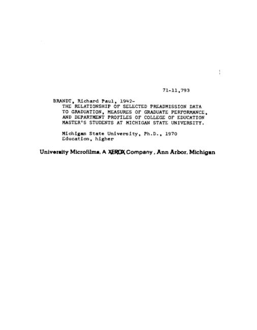 The relationship of selected preadmission data to graduation, measures of graduate performance, and department profiles of College of Education Master's students at Michigan State University