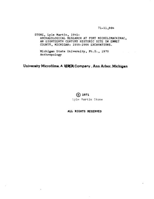 Archaeological research at Fort Michilimackinac, an eighteenth century historic site in Emmet county, Michigan : 1959-1966 excavations