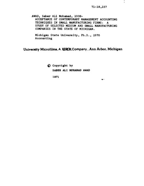 Acceptance of contemporary management accounting techniques in small manufacturing firms : a study of selected medium and small manufacturing companies in the State of Michigan
