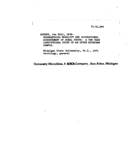 Geographical mobility and occupational achievement of rural youth : a ten year longitudinal study of an upper Michigan sample