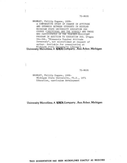 A comparative study of change in attitude and openness between students in regular Michigan State University Education 200 (Individual and the School) and those who participated in the Teacher-Assistant Program in addition to Education 200