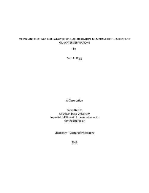 Membrane Coatings for Catalytic Wet-Air Oxidation, Membrane Distillation, and Oil-Water SeparationsBySeth R. HoggThin polymeric films often impart attractive properties to a substrate without substantially altering the performance of the bulk material. This dissertation demonstrates three potential applications of polymeric films to enhance the functionality of membranes for water production and wastewater remediation, which are becoming increasingly important for combatting water scarcity.Layer-by-layer adsorption of polyelectrolytes and citrate-stabilized nanoparticles creates a catalytically active film for wet-air oxidation of pollutants in water. Incorporation of these catalytic films in membranes allows for improved oxygen availability at the catalyst surface in a three phase reaction. In this work, the use of tubular catalytic membranes with small inner diameters (< 1 mm) reduces diffusion limitations relative to similar systems based on larger ceramic membranes. The reduction in the diffusion distance required for aqueous pollutants to reach the catalyst surface leads to a 5- to 10-fold increase in the single-pass pollutant oxidation compared to previous work with ceramic membranes.Deposition of thin, rough polypropylene (PP) coatings rapidly produces superhydrophobic surfaces. Remarkably, addition of such a PP coating to a poly(vinylidene difluoride) (PVDF) membrane increases the advancing water contact angle from 124ᵒ to 155ᵒ. These superhydrophobic membranes are well suited for membrane distillation (MD), where a nonwetted membrane allows water vapor to transfer from a warm feed solution to a chilled permeate phase. During MD with highly fouling humic acid, membranes coated with porous PP show three-fold higher salt rejections than unmodified PVDF membranes. Moreover, the PP-coated membranes resist pore wetting for at least 20 hours during MD of a solution containing dairy whey. In contrast, bare PVDF membranes show pore wetting within 3.5 h of MD with dairy why solutions.Finally, adsorption of charged polyelectrolyte multilayers (PEMs) on membranes increases their hydrophilicity. This increase in hydrophilicity decreases fouling when filtering aqueous solutions with hydrophobic foulants, such as oil and grease. During cross-flow microfiltration of a 0.2% hexadecane-in-water emulsion, flux declines 80% after two hours for a PEM-modified membrane compared to a >90% flux decrease for an untreated membrane. Fouling resistance should be especially high if the foulant and the polyelectrolyte coating have the same charge. Exploiting electrostatic repulsions, the addition of anionic surfactants to oil emulsions causes a nearly two-fold increase in oil droplet rejection by anionically modified membranes.