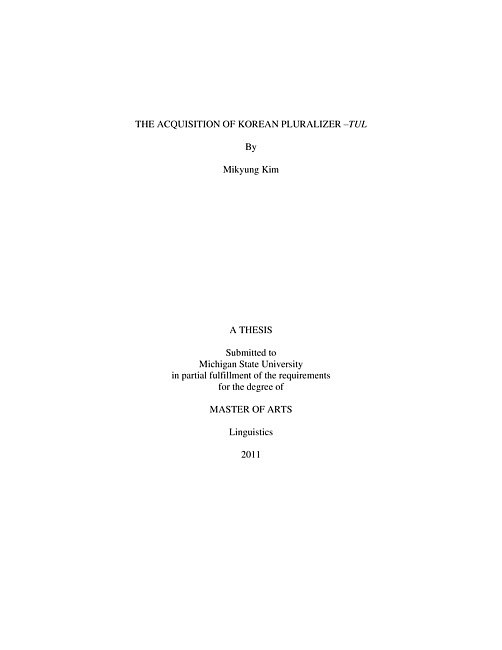 This thesis presents an experiment designed to test children's knowledge of the Korean pluralizer -tul. Acquisition of this pluralizer was investigated in two ways: as an Intrinsic Plural Marker (IPM) attached to nominals and as an Extrinsic Plural Marker (EPM) attached to non-nominals. First of all, the results show that eight-year-olds associated the IPM -tul as plural. Seven- and eight-year-olds, however, were more confident with a singular interpretation than with a plural interpretation. Such behavior is due to the optionality of -tul. If children are exposed to inconsistent input, and the interpretation is ambiguous, the acquisition can be delayed. Second, the results show that the IPM -tul plays the same role in subject and in indirect object. Eight-year-olds treated the IPM -tul equally, regardless of the place that it is attached to. Third, the results with adults' responses suggest that the EPM -tul is associated to a plural subject interpretation. Seven- and eight-year-olds seemed that they did not know the interpretation of the EPM. Fourth, the results show that the EPM is harder for seven- and eight-year-olds to acquire than the IPM. The IPM is attached more locally than the EPM in terms of its semantic effect. Lastly, the results clearly show that there were age differences in acquisition of the pluralizer -tul. Although eight-year-olds were not adult-like, they performed a lot better than seven-year-olds did since they were more likely to be exposed to the plural interpretations.