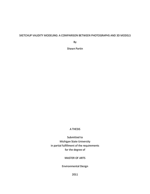 Landscape architects, engineers, urban planners, and designers are interested in the use of 3D models for presentation of designs. The use of 3D models is a centuries]old practice beginning with physical models and advancing to the digital realm. In this study, participants were asked to evaluate the aesthetic quality of 100 images including 25 images of a 3D Google SketchUp 7 (SU) model with 25 corresponding photographs of the same scene and 50 photographs used in a previous study by Burley (1997). There was found to be significant concordance between SU images and corresponding photographs (p<0.025). These findings suggest SU models are valid constructs for photographs, allowing the inference that SU modelsmay be a valid and useful tool for designers when presenting designs to the general public or a typical private client.