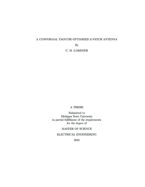 ABSTRACT A CONFORMAL TAGUCHI OPTIMIZED E-PATCH ANTENNA By Chad Michael GardnerThe performance of a cavity-backed E-patch antenna placed conformal to a cylin- drical conducting surface is explored numerically using the finite element boundary integral (FE-BI) method. From using rigorous full-wave simulations based on the finite element method, the effects of curvature are assessed for such antenna charac- teristics as bandwidth and impedance. The necessary changes to the patch geometry to maintain an acceptable impedance match and a desired bandwidth for rectangu- lar cavity-backed E-patch antennas are determined. Cylindrically conformal cavity- backed E-patch antennas are simulated and perform well with many different cylinder radii. A experimental cylindrical conformal cavity-backed E-patch antenna was built to verify simulations and preformed well at the L1 and L2 frequencies. Radiation patterns of both experimental and simulated cylindrically conformal cavity-back E-patch antennas are analyzed and perform well.Taguchi's method of optimization is used to optimize |S11| of rectangular cavity- backed E-patch antennas. Using Matlab and rigorous full-wave simulations based on the finite element method in combination, the effects of having different fitness functions, level differences, and input parameters in Taguchi's method of optimization are explored and determined.