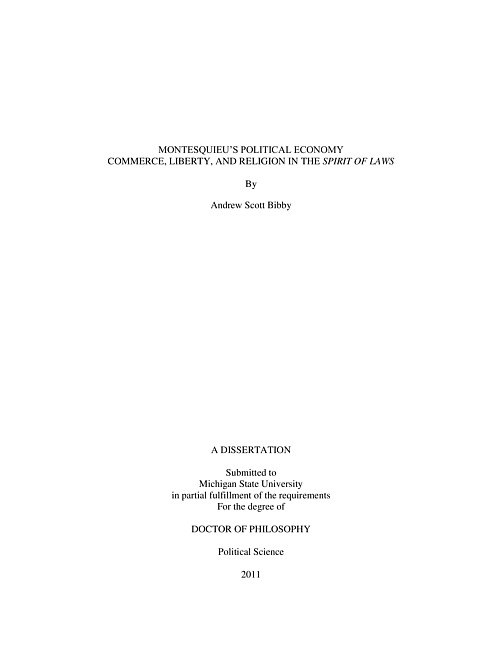This study contributes to our understanding of the historical and intellectual roots of liberal republicanism by analyzing Montesquieu's writings on commerce in the fourth part of the Spirit of Laws. Today, no one doubts that Montesquieu helped to formulate the political doctrines that contributed to the development of liberal republicanism on both the European and American continents. Yet, questions remain about Montesquieu's political intentions. The view of Montesquieu as a worshipper of commercial modernity has been significantly eroded in recent decades. The view of Montesquieu as a “liberal,” or as an advocate of the English political system, has also been challenged. While not ignoring these challenges, this dissertation advocates a return to the idea that England is the “polestar” of Montesquieu's political philosophy. Montesquieu wrote, in the words of Edmund Burke, to “hold out to the admiration of mankind, the Constitution of England.” Such a reading is not new. What this study adds to the debate about Montesquieu's liberalism is, rather, a new window into Montesquieu's political thought. No study has connected Montesquieu's economic thought systematically with his moral and political thought. A failure to make this connection has led to significant interpretative errors. In the topic of commerce, or political economy, Montesquieu found an opportunity to say more than could be openly stated in other parts of the work. The following analysis of Montesquieu's economic writings provides substantial evidence for the view of Montesquieu as a liberal political writer whose purpose was to persuade his reader of the superiority of liberal commercial republicanism over traditional monarchy and classical republicanism.