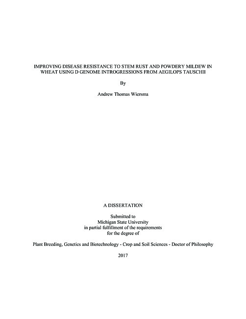 Stem rust (Puccinia graminis) and powdery mildew ( Blumeria graminis) are persistent threats to hexaploid wheat ( Triticum aestivum L., 2n=6x=42, AABBDD) production worldwide. Genetic variation for disease resistance has been limited in the D genome of wheat due to restricted gene flow between T. aestivum and the diploid D genome progenitor species, Aegilops tauschii Coss. (2 n=2x=14, DD). One method to introgress disease resistance from Ae. tauschii to wheat is through direct hybridization and backcrossing with wheat. Using this method, the Ug99-effective stem rust resistance gene SrTA10187 was previously introgressed from Ae. tauschii accession TA10187 and mapped to wheat chromosome 6DS. Development of a high-resolution genetic map surrounding SrTA10187 assigned the resistance locus to a 1.1 cM interval on 6DS and enabled candidate gene identification. To introgress and map powdery mildew resistance in the D genome, introgression lines (ILs) were developed by direct hybridization of the resistant Ae. tauschii accession TA1662 with the susceptible wheat line KS05HW14. Following embryo rescue and recurrent backcrossing to KS05HW14, ILs were developed that only segregate for D genome alleles. Using a combination of genotyping-by-sequencing and KASP2122 SNP markers, a novel powdery mildew resistance gene, designated Pm58, was mapped to 2DS and confirmed to be effective under field conditions. Powdery mildew resistant germplasm, fixed for Pm58 were released for immediate use in disease resistance breeding. -- Abstract.