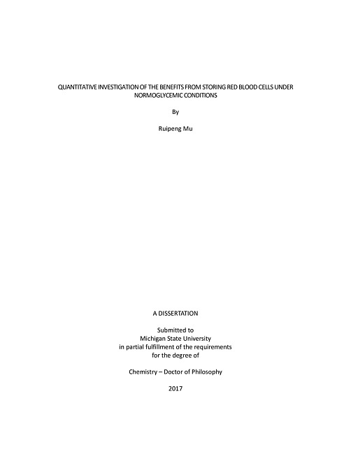 "Red blood cell (RBC) transfusion has become a highly organized and life-saving component of critical healthcare. Approximately 40,000 units of RBCs are transfused every day in the US, therefore the safety and efficiency of RBC transfusions are essential to patients' health. However, post-transfusion complications still exist, therefore remaining a threat to the patients' life. It is well-known that stored RBCs experience metabolic and physical changes during the storage period, collectively known as the storage lesion, which may cause adverse effects after transfusion. The Spence group hypothesizes that the high concentration of glucose present in the blood storage solutions plays an important role in the development of the storage lesion. In order to improve the quality of stored RBCs, normoglycemic versions for the current FDA approved blood storage solutions have been proposed, where the glucose concentrations were modified to 5.5 mM. The benefits of normoglycemic storage of RBCs were quantitatively evaluated through a variety of experiments. First, flow-induced ATP released from stored RBCs was studied using a 3D-printed fluidic device. It is well-known that the primary function of the RBC is to deliver oxygen to tissues. Besides that, the RBC acts as a blood flow regulator by releasing adenosine triphosphate (ATP) into the blood stream. RBC-derived ATP release can stimulate nitric oxide (NO), a known vasodilator, production within endothelial cells, increasing blood flow. RBC derived-ATP release decreases approximately 50% when cells are stored in hyperglycemic environments, compared to normoglycemic storage. This result indicates that RBCs stored in normoglycemic conditions may have improved blood flow during and after transfusion. Next, the mechanism of impaired ATP release was explored by studying cell deformability. This work was done by applying a 3D-printed, multi-port membrane based device accompanied with flow cytometry for cell counting. It is shown that RBCs stored in hyperglycemia lost 15 - 20% of their deformability. One possible element causing cell deformability loss is oxidative damage triggered by the massive production of intracellular sorbitol from RBCs stored in standard storage solutions. In order to further discover the mechanisms of concentrated glucose damage to stored RBCs, cell membrane phosphatidylethanolamine (PE) glycation was analyzed by a high resolution/accurate mass spectrometry. The results showed that the glycated product of PE, Amadori-PE, to normal PE ratio on the RBC membrane decreases as a function of time during the storage period when cells are stored in physiological levels of glucose. In summary, the work here demonstrates that the excess glucose present in storage solutions might be the main contributor for the development of storage lesions. Alternatively, storing RBCs in normoglycemic conditions can reduce the severity of those deleterious effects, therefore having high potential benefits in the clinic."--Pages ii-iii.