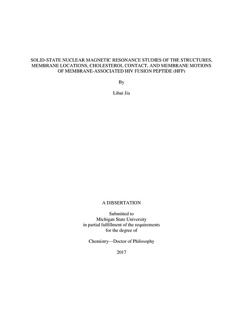Membrane fusion is the key step during HIV viral entry to cells, and the process is catalyzed by HIV membrane fusion protein gp41. HFP is the ~25-residue N-terminal domain of gp41 and is required for membrane fusion with significant decreases in fusion activity with point mutations. Both viral and host cell membrane contain ~30mol % cholesterol (CHOL), and HFP induced fusion is faster in membrane with CHOL. However, how HFP interacts with membrane lipids and CHOL is unknown. In this thesis, we used the newly developed 13C-2H Rotational Echo Double Resonance (REDOR) solid-state NMR method to study the membrane location of HFP in chemically-native membrane environment. HFP is 13CO labeled at specific residue, and the membrane is deuterated at specific regions of the membrane using selective regions deuterated phosphatidylcholine (PC) and CHOL. We study HFP wild type, HFP_V2E and L9R mutants because these two mutants eliminate and decrease fusion respectively. HFP is predominantly β sheet structure in bilayer membrane for both HFP wild type and HFP_V2E mutant, HFP_L9R has a different structure and is likely helical. Both HFP and HFP_V2E mutant have major deeply-inserted membrane location contacting membrane center and minor shallowly-inserted membrane location contacting half way of one membrane leaflet. The HFP_V2E mutant has bigger fraction of molecules with shallower membrane location, which is consistent with the strong correlation between membrane location insertion depth and the peptide fusogenicity. HFP_L9R mutant has majorly deeply inserted into membrane.By comparing the HFP- PC and HFP- CHOL contact, there is preferential contact between HFP and CHOL vs PC at several residues including G5, G10 and G16. The free energy difference for contacting PC vs CHOL is ~ 0.57(5) kcal.mol-1 for T= 300K. HFP- CHOL contact geometry is successfully modeled by Swiss Dock and YASARA energy minimization with two strands antiparallel HFP (1→16/16→1 registry). There are two energetically favorable binding models between HFP and CHOL, from docking, energy minimization and consistency with REDOR results. The contact models reveal tilted and curved-up tail orientation of Chol_d7. Fusion may be catalyzed by matching the curvature of lipids contacting HFPs with the membrane curvature during the fusion intermediates like the stalk. Membrane motion perturbation by HFP is studied by static deuterium NMR from deuterium powder pattern spectrum, order parameter profile and T2 relaxation time. The DMPC-d54 spectrum becomes ~10% narrower in membrane without CHOL with 4% HFP and in membrane with 33% CHOL with 1% HFP. Accordingly, the order parameter of lipid acyl chain becomes ~ 1-10% disordered by HFP. However, the spectrum becomes 20% broader in membrane with 33% CHOL with 4% HFP, and the order parameter of lipid acyl chain becomes ~ 20- 30% ordered by HFP. With HFP at 37 °C, DMPC-d54 T2 decreases ~ 70 %, and the CHOL T2 decreases ~ 30%. T2 reduction is probably associated with increased membrane curvature induced by HFP. With greater membrane curvature, the C-D bond will experience more orientation diversity relative to the external magnetic field. Thus, the quadrupolar field will have greater change, leading to faster relaxation and shorter T2. Gp41_V2E mutant eliminates cell-cell fusion. Our CD spectroscopy studies show that the FPHM_V2E mutant is helical and the melting temperature is above 90 °C in 10mM Tris buffer + 0.2 % SDS at pH 7.4. Protein is trimer and induces no lipid mixing in PC: CHOL= 2:1 vesicles.