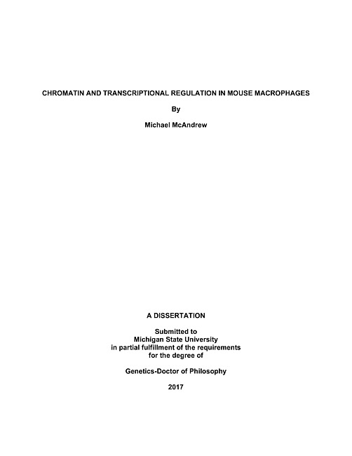 "Eukaryotic genomes must be extensively packaged into a DNA-protein complex called chromatin due to their large sizes and the spatial restrictions of the nucleus. Nucleosomes, the basic repeating unit of this complex, have long been viewed as a barrier to basic cellular processes including transcription, and recent studies suggest that chromatin architecture plays a critical role in the regulation of gene expression. We have used primary bone marrow-derived macrophages (BMDMs) as a model to investigate chromatin changes associated with inducible and cell-type specific gene expression in response to bacterial lipopolysaccharide (LPS). Macrophages are specialized cells of the innate immune system that arise during differentiation from multipotent hematopoietic stem and progenitor cells (HSPCs) through the coordinated action of lineage-specific transcription factors (TFs). These cells have unique functions in response to foreign threat, and previous genome-wide studies have identified macrophage-specific distal enhancers that play a key role in the pro-inflammatory response to LPS. Using a quantitative nucleosome occupancy assay, we have shown that nucleosomes are stably evicted from these enhancers under inducing conditions in BMDMs, and this depletion correlates with signal-induced TF binding and increased gene expression. Using a knockdown approach targeting BAF/PBAF chromatin remodeling complexes, we have shown that nucleosome remodelers are recruited to regulatory elements early during differentiation by lineage-specific TFs, and that disruption of this process results in increased nucleosome occupancy at these elements and prevents nucleosome eviction and gene induction in response to LPS. In order to more precisely determine how and when enhancers might be rendered accessible during differentiation, we further investigated chromatin structure in HSPCs. This led to the surprising finding that nucleosome occupancy may be universally low in these cells. We are now using a genome-wide extension of the quantitative nucleosome occupancy (GNO-seq, Global Nucleosome Occupancy-sequencing) to analyze changes in nucleosome occupancy associated with macrophage differentiation from HSPCs genome-wide. This research will provide crucial insights into the regulation of inducible gene expression, the role of remodelers in maintaining chromatin accessibility, and may demonstrate global differences in chromatin between cell types."--Pages ii-iii.
