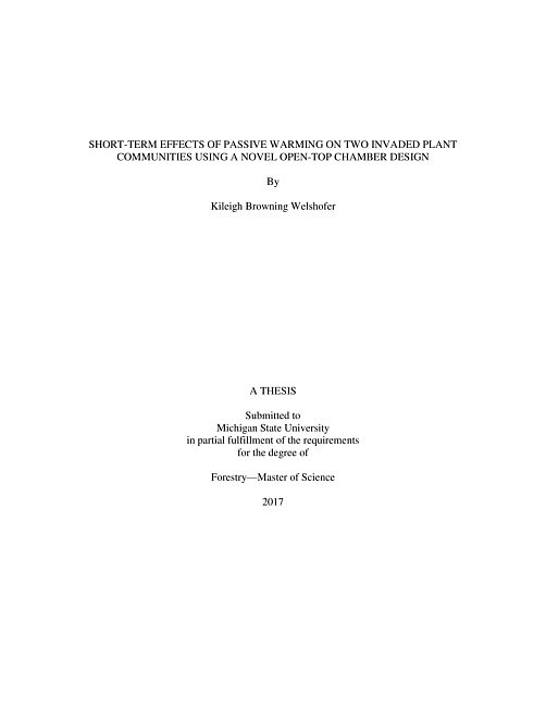 "Climate change is expected to directly favor exotic plant species over native species because they tend to have wider climatic tolerances and greater phenological plasticity. Warming is also likely to indirectly favor exotic species by herbivore behaviors and/or preference and intensifying the enemy release phenomenon. To examine these direct and indirect effects, I initiated a field experiment in two heavily invaded plant communities in northern and southern Michigan, USA. Passive warming methods such as open-top chambers are often used to warm aboveground systems; however, the limited height of their design restricts their use to low-stature (0.03034 m) plant communities. I introduced a new chamber design for year-round warming in taller stature (1.03035 m) plant communities and analyzed its effects on the abiotic environment. During the second year of warming, I collected data for species cover, phenology (green-up, flowering time, timing of seed set), and cumulative leaf herbivory. The new chamber design achieved reliable levels of warming (+1.8 ºC), consistent with all four Representative Concentration Pathways (RCPs) scenarios for 2046-2065 from the Intergovernmental Panel on Climate Change's 5th Assessment Report. The effects of warming were largely consistent with theoretical expectations at the northern site and favored exotic plant abundance. Warming did not favor exotic species dominance at the southern site, but rather responses indicated plants at this site experienced physiological stress, likely because ambient temperatures were already close to plant species' thermal maxima."--Page ii.