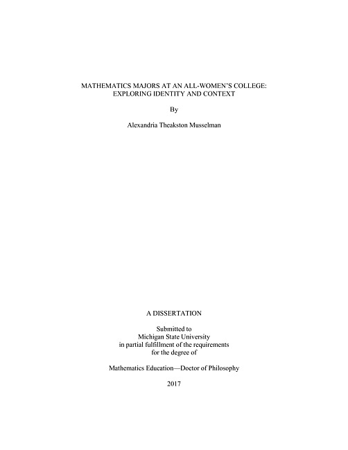 Drawing on identity theory, sociocultural theories of learning, and discourse analysis, I engage in an analysis of in-depth, individual interviews with four mathematics majors at an all-women’s college over an academic year. The purpose of this qualitative study is to gain insight into the mathematical identities of senior women mathematics majors, to understand their assumptions about what it means to know and do mathematics, and to describe the role that an all-women’s content might play in their descriptions of themselves or of mathematics. As such, I focus on identity, context, and Discourses. The concept of a mathematical identity–being recognized as a mathematical person in a given context–is central to this study. To this end, I pose the following research questions:What language do senior women mathematics majors at an all-women’s college use to describe their mathematical identity development?How might the context of an all-women’s mathematics department be described as relevant to students’ identity development? Specifically, what activities do mathematics majors at an all-women’s college describe as significant to their experience and how do they describe their relationship to others within that context?What mathematical Discourses do senior women mathematics majors at an all-women’s college know, assume, question, or reject? What seems to be the relationship between their identities and those Discourses? The first research question focuses on identity development and recognition, that is, how student’s discourse describes their mathematical identity development and other related identities. The second set of questions focuses on description of the particular all-women’s context of Metcalf, particularly the community practices and relationships. The third set of questions focuses on developing and understanding participants’ interpretive and evaluative models–specifically, about what it means to know and do mathematics as a woman. Overall, my aim is threefold: to be able to say something meaningful about (a) who these women are, (b) what meaning is ascribed to knowing / doing mathematics by these women, and (c) how the context of an all-women’s college seemed to shape their relationship with mathematics.