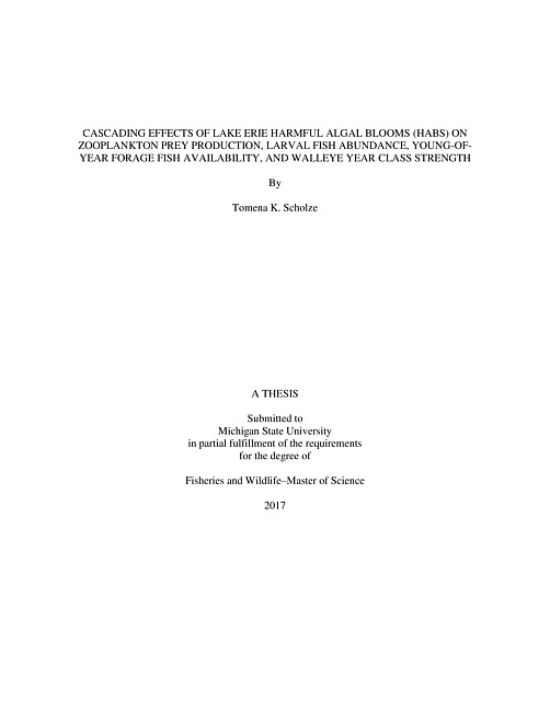 In Lake Erie, walleye (Sander vitreus) fishery recruitment is controlled by physical and biological processes acting on early life history stages; however, the impacts of recent, recurring cyanobacterial (Microcystis aeruginosa) blooms on fishery ecosystem productivity are largely unknown. I hypothesized these harmful algal blooms (HABs) would negatively impact walleye recruitment in a trophic cascade framework by altering algal community species and size composition, limiting suitable food particles available to zooplankton and therefore decreasing zooplankton abundance and causing a shift in community composition. This would directly impact the prey resources available to larval fishes during critical life stages, affecting their growth, survival, and recruitment to the young-of-year (YOY) stage. I investigated the potential for Lake Erie HABs to impact YOY forage fish availability and walleye year class strength using fisheries-independent data from the annual western basin interagency bottom trawl survey and satellite-derived estimates of HAB severity for 2002-2014. I further assessed how HABs impact zooplankton and ichthyoplankton prey availability by sampling Microcystis, zooplankton, and larval fishes in the western basin in 2015 and 2016. HABs did not have a significant impact on walleye year class strength, but they did impact the distribution of YOY and larval fishes in the western basin, in particular clupeid species. However, HABs were associated with increased zooplankton production, suggesting HABs directly impact larval and planktivorous fishes, rather than indirectly decreasing their abundance by limiting the availability of zooplankton prey.