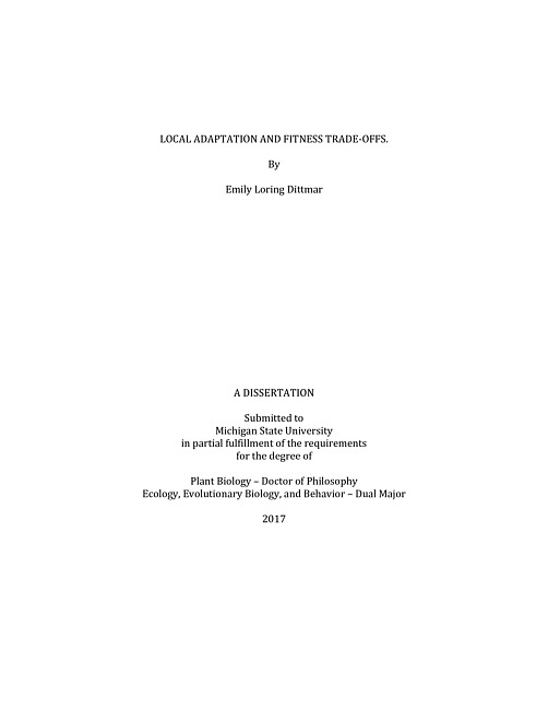 Adaptation generates and maintains genetic and phenotypic diversity. This is thought to occur due to trade-offs, where adaptation to one environment comes at a cost in another. Although trade-offs are believed to play a prominent role in the generation and maintenance of genetic and phenotypic diversity, the mechanisms by which adaptation leads to trade-offs are not well understood.My research explores the forces that lead to adaptive trade-offs in two systems. First, using a RIL mapping population created from natural populations of Arabidopsis thaliana, I studied the genetic basis of flowering time, a putatively adaptive trait and one that differs between the parental populations. I identified flowering time QTL in growth chambers that mimicked the natural temperature and photoperiod variation across the growing season in each native environment and compared the genomic locations of flowering time QTL to those of fitness (total fruit number) QTL from a previous three-year field study.In addition, I studied two populations of Leptosiphon parviflorus, an annual wildflower native to California. At Jasper Ridge biological preserve, populations of L. parviflorus grow on and off serpentine soil in close proximity. Due to its harsh growing conditions, serpentine soil exerts strong selective pressures on plants. Despite the close proximity of study populations (<100 m) and ongoing gene flow, reciprocal transplant studies demonstrate that these populations are locally adapted to their native soil types. To determine the selective agents operating in both habitats and the forces underlying fitness trade-offs, I performed manipulative experiments in the field and greenhouse. Results from these studies show that both soil moisture and competitive interactions are important for mediating fitness differences among the populations, and adaptation to serpentine soil might result in a cost to competitive ability.I also addressed the causes of flowering-time differences in these populations. Field reciprocal-transplant studies and watering manipulations in the greenhouse demonstrate the contribution of both the genotype and the environment to observed flowering-time differences. The plasticity of flowering time in response to soil type appears to be driven by differences in soil moisture. In addition, selection on flowering time was measured in both soil types across four years of study using a set of F5 advanced generation hybrids and found to differ among the habitats. Therefore, both selection and plasticity contribute to flowering-time differences between these populations and thus have likely played an important role in the initiation and/or maintenance of adaptive divergence in this system.Finally, the two populations differ in their flower color, a Mendelian trait. Pollinators do not discriminate among flower colors and are unlikely to exert selection on this trait. Instead, flower color may be related to stress tolerance if the causal gene has pleiotropic effects on other traits. Using a set of Near Isogenic Lines (NILs), I found that the flower color locus has an effect on survival in field soil and fecundity in benign conditions. Ongoing work is aimed at addressing the mechanisms underlying the relationship between flower color and soil adaptation.