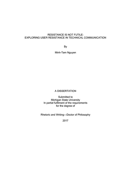 Despite ongoing investments to technology and usability in technical communication—and despite ongoing commitments to humanistic perspectives concerning those two domains—scholars of technical communication have yet to explore the topic of “user resistance” explicitly. User resistance gained prominence in fields like Information Technology (IT), Management Information Systems (MIS), and related fields and has traditionally been conceptualized as oppositional, hostile, or adversarial—a phenomenon meant to be avoided before it occurs. Because of this, traditional definitions of user resistance value the systems with which users engage, with little work theorizing the contexts, behaviors, and agencies of actual users. My dissertation responds to this lack of a user-centered approach by offering a thick literature review that examines how resistance is defined and situated across a range of scholarship. From this literature review, I offer a theory of user resistance that draws on the concept of “everyday resistance” (Vinthagen & Johanssen, 2012) to value users and their contexts. By situating the work done on resistance and providing a theoretical concept of user resistance, I then rhetorically analyze two examples of user resistance on the social networking site, Tumblr to illustrate how and why users resist in dynamic online spaces. The first example demonstrates how users resist within a system to design changes and the second illustrates the how users resist systems of power and oppression created and upheld (implicitly and explicitly) by the site developers and designers. Through an analysis and discussion of these examples, my dissertation seeks to start conversations about user resistance in the domain of technical communication and pivot existing conversations outside the field from a negative phenomenon meant to be avoided before it occurs, to a productive area of inquiry for technology design. Ultimately, I argue that attending to user resistance allows for a more nuanced and engaged approach to user-centered, participatory, and ethical design principles. By examining user resistance, technical communication researchers and practitioners can attend to the local, contextual, and most importantly dissonant needs of users.