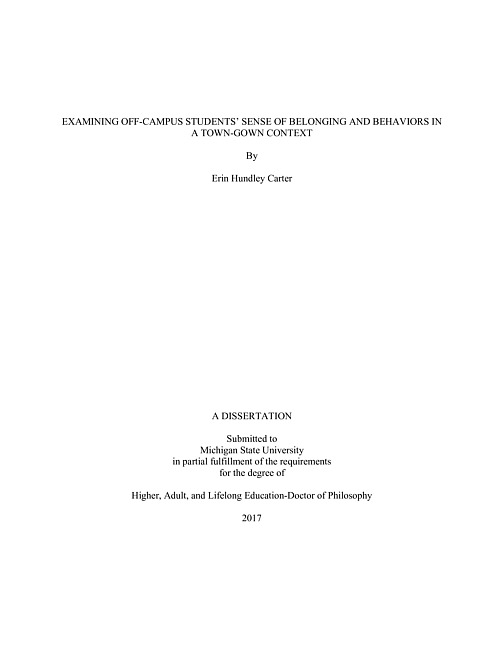 The current study emerged from the need to address student behavior issues in town-gown communities and the practical need to know more about off-campus students as central actors in these behaviors. Off-campus students have long been labeled as commuter students because of limited recognition of the known diversity within the commuter population (Dugan, Garland, Jacoby, & Gasiorski, 2008) and an absence of town-gown scholarship focused on college student residents of the local community (Kemp, 2013). The current study sought to remedy the little attention given to off-campus students through the exploration of their sense of belonging to the local community, and in turn, how sense of belonging influenced behavior in the town-gown context. An American college town was the town-gown context chosen for the current study because of its capacity to showcase the unique influence the university has on the character of the town (Gumprecht, 2008). Using a stratified random sampling, the sample (n = 645) was drawn from the population of undergraduate students living off campus in the City of East Lansing, Michigan. Strata were determined based on residential density levels due to an interest in assessing how residential environments of varying densities influenced sense of belonging in off-campus students. The current study utilized sense of belonging and town-gown literature to guide the selection of exogenous and intervening predictor variables relevant in the town-gown context. These predictor variables included demographic characteristics (e.g., age, sex, race, year in school) and density categorization along with intervening variables such as environmental perceptions, social interactions, and behavior participation. Criterion variables included sense of belonging and positive and negative behavior participation. Hierarchical regression analyses were used to determine the extent these demographic and community factors influenced sense of belonging, as well as how sense of belonging influenced participation in positive and negative behaviors in the town-gown context. The study concluded off-campus students were a unique cohort in the student population, warranting future attention from scholars and practitioners. Sense of belonging was not predicted by demographic and density characteristics, but was positively influenced by perceptions of community (e.g., reliability, friendliness) and positive behavior participation (e.g., attending community events, utilizing city services). Number of roommates, semesters lived off-campus, and residential density associated with houses were positive predictors of behavior participation, both positive and negative. Environmental and social relations constructs were positive predictors of both positive and negative behavior participation. Sense of belonging was a positive predictor of positive behavior participation, but was not a predictor of negative behaviors. The discussion offers insights and direction for town-gown administrators tasked with creating policy and practical interventions aimed at supporting off-campus students, while also addressing the unique challenges stemming from student behaviors in the local community.