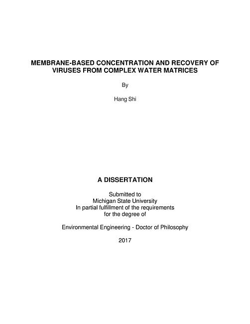 "Prevention of waterborne disease outbreaks relies on the efficient detection of pathogens in drinking and recreational water. Development of sample concentration technologies that ensure fast and high recovery of pathogens from aquatic samples is crucial for timely detection. The most effective approaches to sample concentration and virus recovery employ membrane filtration and rely on controlling physicochemical interactions between the virus and the filter. The two main goals of the present work were to understand the reasons for the poor efficiency (typically below 30%) of the current methods in recovering human adenovirus and to propose alternative strategies that facilitate concentration and recovery of this important human virus. The first part of the dissertation is devoted to the study on how common methods of virus propagation (broth-based and agar-based) and purification (polyethylene glycol precipitation, centrifugal diafiltration and CsCl density gradient centrifugation) affect physicochemical properties of virions. Experimental data for bacteriophage MS2 showed that results of virus size, charge, and hydrophobicity measurements depend strongly on the methods and protocols used to grow and purify the virus. The optimal sample preparation protocol was determined to consist of broth-based growth followed by purification via CsCl density gradient centrifugation. This method was then used to measure physicochemical properties of human adenovirus 40 (HAdV40) and employ these values to calculate the energy of virion-virion and virion-membrane interactions. The second part of the dissertation describes an experimental study on the recovery of HAdV40 from three water matrices (spiked deionized water, tap water, and high organic content surface water) by crossflow ultrafiltration. Prior to ultrafiltration, membranes were either blocked by calf serum or coated with a polyelectrolyte multilayer to minimize virus adsorption on the membrane surface. The multilayer was designed to be antiadhesive with respect to HAdV 40 using the virus-membrane interaction energy calculations performed earlier. In the sample concentration tests, HAdV 40 was recovered from ultrapure water, tap water, and surface water with very high post-elution recoveries of 990303%, 910303%, and 840303%, respectively. The obtained recovery data were interpreted in terms of physicochemical interactions of HAdV40 virions with the membrane and how components of the eluent disrupt specific interactions between HAdV40 and the membrane to maximize HAdV40 recovery. Results on HAdV40 concentration indicate that the composition of the eluent is the most important factor for achieving high virus recovery and can be designed to efficiently recover viruses even from highly complex water matrices."--Pages ii-iii.