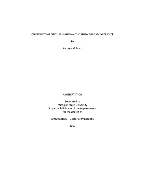 Currently, over 313,000 U.S. students study abroad for credit each year (Open Doors 2016); this is a 300% increase from twenty years ago. However, this figure still highlights that less than 3% of the U.S. undergraduate population participates in an academic program abroad. A proliferation of students studying abroad took place in the 1990s when higher education institutions began building and offering short-term, faculty-led programs. Fifty years ago, the typical study abroad student went to a private liberal arts college and spent a semester or a year abroad. Today, 63% of all students studying abroad go on short-term programs, followed by 34% on semester-long programs and 3% going for the entire academic year. Students at large state universities as well as community colleges are now the major demographic included in the short-term numbers. These shifts (from liberal arts to state universities as well as from semester-long to short-term) has sparked debates among institutions and educators about whether students on short-term, faculty-led programs can obtain just as much cultural competency as semester-long programs. Case studies from a short-term, faculty-led program to Ghana explore how U.S. students navigate “disorienting dilemmas” such as attending a bonesetter healing session, making friends with local counterparts, conducting health related field exercises in a peri-urban village and working on a service learning project. Ethnographic vignettes presented in this dissertation qualitatively capture the complexity students’ face as they struggle to learn about their new community in Ghana as well as themselves. This dissertation argues that U.S. study abroad students studying on faculty-led, short-term programs can obtain cultural competency abroad, and that qualitative, ethnographic research can be used to understand students’ of cultural competency on short-term study abroad programs. I suggest that transformational learning occurs when certain pedagogical factors are in place, such as faculty knowledge of the field site, structured writing assignments, and a theory/praxis engagement. I also demonstrate that anthropological theories and methods are useful frameworks for helping international educators develop and assess “high impact” study abroad programs. Finally, I argue that using qualitative, ethnographic data on study abroad outcomes directly and successfully contributes to the comprehensive internationalization of higher educational institutions.
