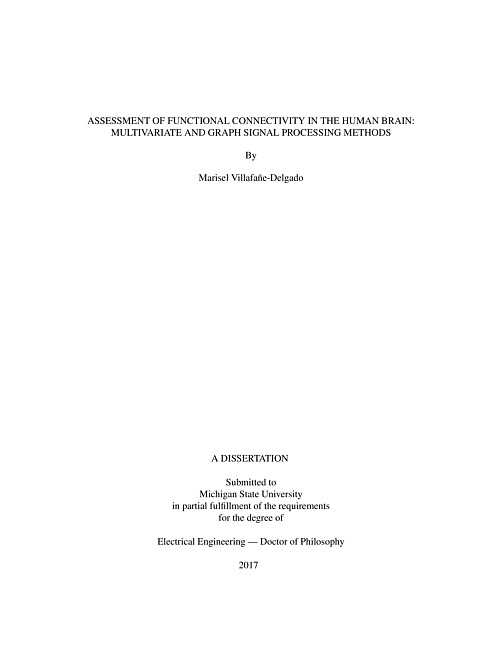 "Advances in neurophysiological recording have provided a noninvasive way of inferring cognitive processes. Recent studies have shown that cognition relies on the functional integration or connectivity of segregated specialized regions in the brain. Functional connectivity quantifies the statistical relationships among different regions in the brain. However, current functional connectivity measures have certain limitations in the quantification of global integration and characterization of network structure. These limitations include the bivariate nature of most functional connectivity measures, the computational complexity of multivariate measures, and graph theoretic measures that are not robust to network size and degree distribution. Therefore, there is a need of computationally efficient and novel measures that can quantify the functional integration across brain regions and characterize the structure of these networks. This thesis makes contributions in three different areas for the assessment of multivariate functional connectivity. First, we present a novel multivariate phase synchrony measure for quantifying the common functional connectivity within different brain regions. This measure overcomes the drawbacks of bivariate functional connectivity measures and provides insights into the mechanisms of cognitive control not accountable by bivariate measures. Following the assessment of functional connectivity from a graph theoretic perspective, we propose a graph to signal transformation for both binary and weighted networks. This provides the means for characterizing the network structure and quantifying information in the graph by overcoming some drawbacks of traditional graph based measures. Finally, we introduce a new approach to studying dynamic functional connectivity networks through signals defined over networks. In this area, we define a dynamic graph Fourier transform in which a common subspace is found from the networks over time based on the tensor decomposition of the graph Laplacian over time."--Pages ii-iii.