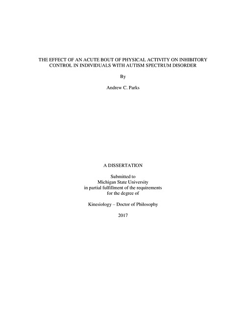 "Given the growing prevalence of autism spectrum disorder (ASD) in the U.S., many researchers have dedicated their work to improving the quality of life for this population through the reduction in ASD symptoms. Interestingly, a growing body of research has suggested these symptoms may be related to aspects of cognitive function that have been shown to be affected by short-bouts of physical activity. Therefore, this study sought to explore the effects of short duration physical activity on cognitive function in individuals with ASD. For this study, 18 individuals with ASD and 18 typically developing (TD) individuals completed a computer task to assess cognitive function before and after either walking on a treadmill or sitting while reading. Findings from the study indicated that participants with ASD had poorer response accuracy to the task when compared to their TD peers. Additionally, prior to the walking condition, participants with ASD responded slower on average when compared to their performance prior to the reading condition. Although there is evidence supporting a difference between those with ASD and their TD peers in cognitive function, it is still unclear what role physical activity may play in addressing this difference. However, this study does provide an initial foundation for future research in this area by providing insight for study designs and feasibility in this area of research."--Page i.