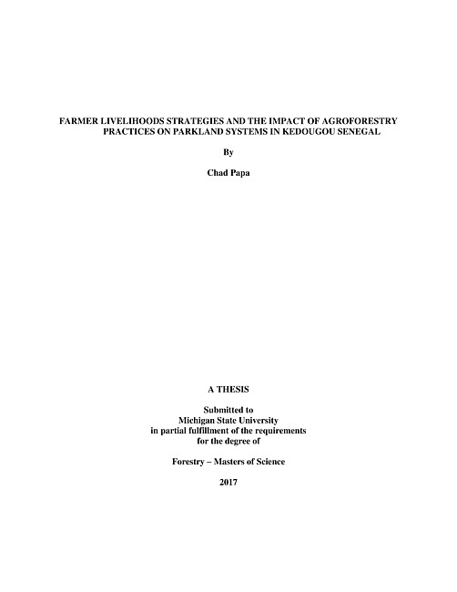 "Farmers throughout West Africa have always faced adverse conditions and high vulnerability with regards to management of their agroecological systems, but climate change poses a new challenge to the sustainability of farming systems. Through field research conducted in the department of Kedougou in southwestern Senegal, I identified and analyzed livelihood strategies, and investigated the effects of climate change on farmer's management of their agroecological systems. Using the rural livelihood framework, I used focus group discussions to assess farmers' management approaches when facing climate related disturbances to agroecological systems. With the survey results, I used a regression model to analyze whether or not agroforestry has impacted farmer livelihood with regards to the valuation of on-farm activities through crop yields and livestock holdings. The lack of statistical significance from the regression model might point towards a lack of impact from agroforestry practices; however, the multiple co-benefits of agroforestry cannot be overlooked to reducing vulnerability. This study shows that West African farmers generally use approaches that enhance the resiliency of their agroecological systems to sustain their livelihoods when facing adverse environmental challenges, but that agroforestry has not shown to impact livelihoods in terms of production."--Page ii.
