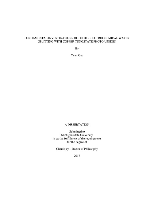 "An increasing global energy demand along with detrimental consequences of extensive usage of fossil fuel calls for the development of abundant, cost effective and carbon neutral alternative energy sources. Solar energy is well distributed and is the most abundant energy source available on Earth. This work focuses on using copper tungstate (CuWO4) photoelectrode to harvest sunlight to oxidize water, which constitutes the rate limiting half reaction of photoelectrochemical water splitting to generate clean and carbon neutral energy dense fuel, hydrogen, and the byproduct, oxygen. CuWO4 is a promising photoanode material for water splitting owing to its reasonably small bandgap, suitable band position, stability and abundance, but has received limited attention due to its reported poor bulk properties and low hole collection efficiency at the surface. A lack of fundamental insight into its limitations hinders rational design of strategies to improve its performance. We developed an atomic layer stack deposition-annealing (SDA) method derived from atomic layer deposition (ALD) to synthesize our CuWO4 thin films. While keeping the benefit of precise thickness control of a uniform film as traditional ALD procedures, this new approach of ALD of ternary metal oxides allows for a wider selection of precursors since their ALD temperature windows do not have to overlap, and it allows for an easier control of stoichiometry. The hole collection efficiency at the electrode surface was quantified by comparing water oxidation and the oxidation of a suitable hole scavenger, as well as by intensity modulated photocurrent spectroscopy (IMPS). Our results showed that water oxidation with CuWO4 is limited by surface recombination at low applied bias, but is essentially quantitative at higher potentials. A series of photoelectrochemical and electrochemical impedance spectroscopic measurements were employed to elucidate the role of surface state of CuWO4 during water oxidation. Our results suggested that the surface state of CuWO4 is related to a water oxidation intermediate species rather than intrinsic, as is opposed to previous literature. Relatively thick CuWO4 electrodes were made by spray pyrolysis and the pores were back-filled with Al2O3 to produce compact films for bulk studies. Illumination direction and wavelength dependent photoelectrochemical measurements were employed to investigate the bulk properties of CuWO4 for water oxidation, which suggested that the major problem of CuWO4 is a short electron collection length."--Pages ii-iii.