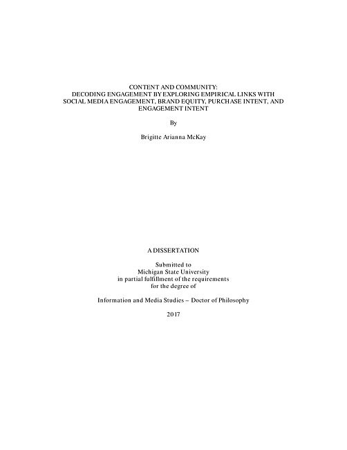 Content and community : decoding engagement by exploring empirical links with social media engagement, brand equity, purchase intent, and engagement intent