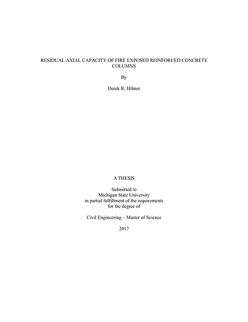 "Fire represents one of the most severe environmental loading conditions that a structure may experience during its design lifetime. Reinforced Concrete (RC) structural members can experience some level of damage following moderate or severe fire exposure. To ensure safe future use of the structure, and to develop adequate retrofitting measures for fire damaged concrete members, it is essential to evaluate the residual capacity of RC members following fire exposure and prior to re-occupancy. A limited number of experimental studies and approaches exist today that accounts for the residual capacity of fire exposed RC columns. Therefore, experimental studies have been undertaken as part of this research to understand the post-fire behavior of RC columns exposed to realistic fire scenarios. Two full-scale normal strength concrete (NSC) columns have been cast and subjected to realistic restraint, loading and fire exposure conditions. The experimental studies conducted indicate that peak rebar temperatures can occur up to 100 minutes and 80 minutes after the end of the heating phase of a 90-minute and 120-minute fire exposure, respectively. The post fire residual capacity testing indicated that the RC columns can retain up to 34% of its real nominal capacity for a 90-minute exposure and up to 29% for a 120-minute exposure. However, much of the design capacity of columns is retained after exposure to fire. In addition to the experimental studies undertaken, a numerical model developed using the commercially available finite element (FE) software, ABAQUS, is used to predict the thermal and mechanical response of RC columns before, during and after realistic fire exposure."--Page ii.