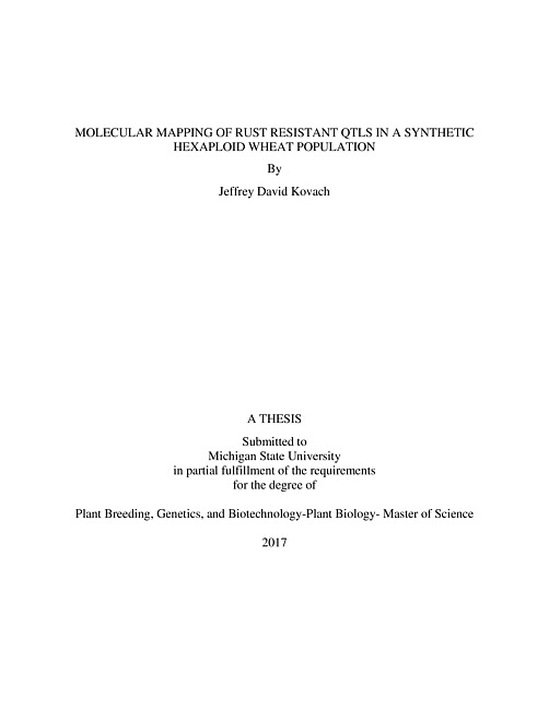 "Triticum aestivum, common wheat, is a widely grown crop that is responsible for a large portion of worldwide consumed calories. Bread wheat is an allohexaploid derived from a series of hybridization and polyploidization events between three diploid progenitor species. Due to its origin, genetic diversity across the hexaploid wheat genome is lacking, especially in the D genome. Ae. tauschii, the D genome diploid progenitor, is an important source of D genome variation and has been used to identify novel genes for multiple traits including disease resistance. The evolution and spread of new pathogenic Puccinia races highlight the need to identify and utilize novel sources of disease resistance. A recombinant inbred line population was derived from a cross between the synthetic 9.131.15(tetraPrelude/TA2474) and KS05HW14, a hard white winter wheat. This population was phenotyped for resistance to stem, stripe and leaf rust. All-stage resistance to stem and stripe rust was mapped on 5BL and 4DS originating from 9.131.15 and TA2474, respectively. Leaf rust resistance was mapped to 3BL and adult plant resistance QTLs were mapped to the 6D and 7D chromosomes for leaf and stem rust resistance in Mason, MI in 2017. This study identifies resistance to all three Puccinia rust species in this RIL population. However, further work is needed to determine if the 4DS and 5BL loci are novel and the identified adult plant resistance QTLs can be repeatedly observed. A single RIL was phenotyped as resistant to all three Puccinia fungal pathogens in all tested environments. This line can be used as a useful source of disease resistance to these fungal pathogens."--Page ii.