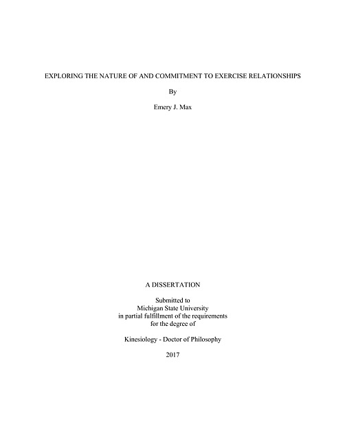The United States population suffers from poor health, largely as a consequence of physical inactivity. Only a small minority of Americans meet or exceed the daily physical activity guidelines prescribed by the American College of Sports Medicine. One of the most frequently cited barriers to engaging in physical activity is lack of an exercise partner, and the ergogenic benefits of social factors in exercise have been well-documented. Despite the widely-recognized value of an exercise partner among health scientists and the lay public, there has been no research to date examining the nature of exercise relationships (i.e., the relationships between exercise partners). This dissertation presents two studies exploring the nature of exercise relationships – the first characterizes exercise relationships on a variety of relationship and exercise factors and the second examines antecedents and consequences of psychological commitment to an exercise relationship. Both studies employed an anonymous web survey. The first study was the first inquiry into exercise relationships. Based on theories of interpersonal communication and relationship development, the first study examined the exercise relationships of undergraduates at a large Midwest university and focused on relationship quality (i.e., interpersonal closeness & communication). Exercise relationships typically began outside of an exercise context, emerging from pre-existing relationships (77.0%). Exercise relationships were characterized by a high degree of interpersonal closeness, reporting closeness values significantly higher than the scale midpoint, (M = 5.07, SD = 1.56), t(381) = 13.44, p < .001. Participants reported talking about a greater number of topics outside workouts (M = 6.53, SD = 2.50) than in typical workouts (M = 4.21, SD = 2.69), t(382) = 14.82, p < .001. In addition to conversation, participants reported agreement higher than scale midpoint for reciprocal exercise encouragement (M = 4.04, SD = 0.81), t(382) = 25.10, p < .001, in typical workouts. Lastly, participants reported values higher than scale midpoint on mutual goal facilitation (M = 3.76, SD = 0.79), t(382) = 18.83, p < .001, suggesting that exercise relationships are characterized by closeness, high communication breadth, and cooperation rather than competition.The second study examined antecedents and consequences of psychological commitment to an exercise relationship. Support was found for a model of commitment in exercise relationships, where psychological commitment was predicted by satisfaction with the exercise relationship, attractiveness of alternatives to the exercise relationship, and investment in the exercise relationship, and the predictors accounted for nearly half of the variance in psychological commitment, F(3, 518) = 146.80, p < .001, R2 = .46. Path analyses revealed that psychological commitment predicted behavioral commitment to the exercise relationship, which in turn predicted total individual physical activity.