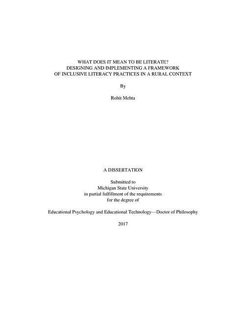 "Written as two interconnected articles, this dissertation study is about identifying literacy practices that are inclusive of multiple ways of being, knowing, and doing. Using these, the purpose of this study is to create a framework of inclusive literacy practices that teachers and researchers can use--implement and refine--based on their contextual needs and expectations. Driven by the rhetorical question of 'What does it means to be literate?' I use three lenses of culturally sustaining pedagogy, transdisciplinary thinking, and multiliteracies to challenge normative practices that dominate acceptable ways of being, knowing, and doing in the world. To achieve this, I conducted a two-part study. In this first part, I reviewed 170 highly cited articles to compile a framework of ten literacy practices--five for learners and five for teachers--that I call Culturally sustaining, Transdisciplinary, Multiliteracies (CTM) Practices. Using this preliminary framework, I offered a set of guidelines for teachers to implement it in their classrooms. In the second part, to test the feasibility of the framework, I situated myself in an underrepresented context in multicultural education--a predominantly white rural school, and studied the affordances and constraints of the framework. I designed an embedded case study and used ethnographic methods and critical discourse analysis to analyze the framework. I found that CTM Practices framework faced four major challenges: forms of marginalization disguised in practices of social networking, distancing from experiences of other people and places, conflict between discourses of school and self, and siloed practices and definitions of literacies. I offered resolutions for each of the challenges, and found the framework to be adaptable to the rural contexts. I call for further implementation of this framework across new contexts to test its feasibility"--Pages ii-iii.
