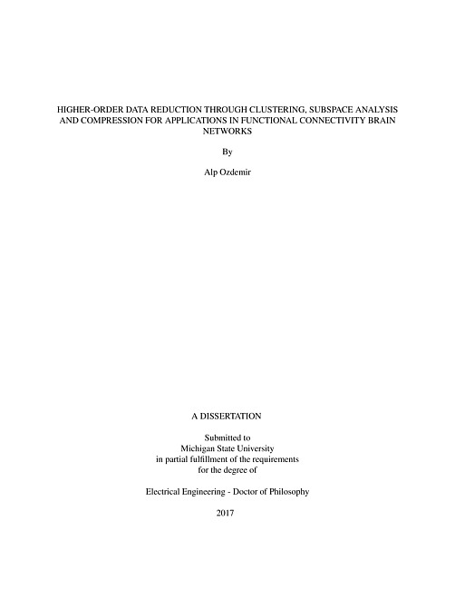 "With the recent advances in information technology, collection and storage of higher-order datasets such as multidimensional data across multiple modalities or variables have become much easier and cheaper than ever before. Tensors, also known as multiway arrays, provide natural representations for higher-order datasets and provide a way to analyze them by preserving the multilinear relations in these large datasets. These higher-order datasets usually contain large amount of redundant information and summarizing them in a succinct manner is essential for better inference. However, existing data reduction approaches are limited to vector-type data and cannot be applied directly to tensors without vectorizing. Developing more advanced approaches to analyze tensors effectively without corrupting their intrinsic structure is an important challenge facing Big Data applications. This thesis addresses the issue of data reduction for tensors with a particular focus on providing a better understanding of dynamic functional connectivity networks (dFCNs) of the brain. Functional connectivity describes the relationship between spatially separated neuronal groups and analysis of dFCNs plays a key role for interpreting complex brain dynamics in different cognitive and emotional processes. Recently, graph theoretic methods have been used to characterize the brain functionality where bivariate relationships between neuronal populations are represented as graphs or networks. In this thesis, the changes in these networks across time and subjects will be studied through tensor representations. In Chapter 2, we address a multi-graph clustering problem which can be thought as a tensor partitioning problem. We introduce a hierarchical consensus spectral clustering approach to identify the community structure underlying the functional connectivity brain networks across subjects. New information-theoretic criteria are introduced for selecting the optimal community structure. Effectiveness of the proposed algorithms are evaluated through a set of simulations comparing with the existing methods as well as on FCNs across subjects. In Chapter 3, we address the online tensor data reduction problem through a subspace tracking perspective. We introduce a robust low-rank+sparse structure learning algorithm for tensors to separate the low-rank community structure of connectivity networks from sparse outliers. The proposed framework is used to both identify change points, where the low-rank community structure changes significantly, and summarize this community structure within each time interval. Finally, in Chapter 4, we introduce a new multi-scale tensor decomposition technique to efficiently encode nonlinearities due to rotation or translation in tensor type data. In particular, we develop a multi-scale higher-order singular value decomposition (MS-HoSVD) approach where a given tensor is first permuted and then partitioned into several sub-tensors each of which can be represented as a low-rank tensor increasing the efficiency of the representation. We derive a theoretical error bound for the proposed approach as well as provide analysis of memory cost and computational complexity. Performance of the proposed approach is evaluated on both data reduction and classification of various higher-order datasets."--Pages ii-iii.