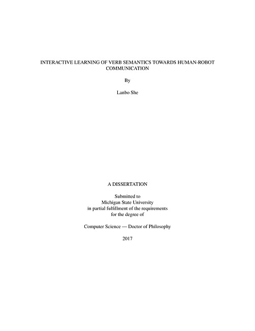 "In recent years, a new generation of cognitive robots start to enter our lives. Robots such like ASIMO, PR2, and Baxter have been studied and applied in education and service applications. Different from traditional industry robots doing specific repetitive tasks in a well controlled environment, cognitive robots must be able to work with human partners in a dynamic environment which is filled with uncertainties and exceptions. It is unlikely to pre-program every type of knowledge (e.g., perceptual knowledge like different colors or shapes; action knowledge like how to complete a task) into the robot systems ahead of time. Just like how children learn from their parents, it's desirable for robots to continuously acquire knowledge and learn from human partners on how to handle novel and unknown situations. Driven by this motivation, the goal of this dissertation is to develop approaches that allow robots to acquire and refine knowledge, particularly, knowledge related to verbs and actions, through interaction/dialogue with its human partner. Towards this goal, this dissertation has made following contributions i . As a first step, we propose a goal state based verb semantics and develop a three-tier action/task knowledge representation. This representation on one hand supports the connection between symbolic representations of language and continuous sensori-motor representations of the robots; and on the other hand, supports the application of existing planning algorithms to address novel situations. Our empirical results have shown that, given this representation, the robot can immediately apply the newly learned action knowledge to perform actions under novel situations. Secondly, the goal state representation and the three-tier structure are integrated into a dialogue system on board of a SCHUNK robotic arm to learn new actions through human-robot dialogue in a simplified blocks world. For a novel complex action, the human can give an illustration through dialogue using robot's existing action knowledge. Comparing the environment changes before and after the action illustration, the robot can identify a goal state to represent the novel action, which can be immediately applied to new environments. Empirical studies have shown that action knowledge can be acquired by following human instructions. Furthermore, the results also demonstrate that step-by-step instructions lead to better learning performance compared to one-shot instructions. To solve the insufficiency issue of applying the single goal state representation in more complex domains (e.g., kitchen and living room), the single goal state is extended to a hierarchical hypothesis space to capture different possible outcomes of a verb action. Our empirical results demonstrate that the representation of hypothesis space, combined with the learned hypothesis selection algorithm, outperforms approaches using single hypothesis representation. Lastly, we address uncertainties in the environment for verb acquisition. Previous works rely on perfect environment sensing and human language understanding, which does not hold in real world situation. In addition, rich interactions between teachers and learners as observed in human teaching/learning have not been explored. To address these limitations, the last part presents a new interactive learning approach that allows robots to proactively engage in interaction with human partners by asking good questions to handle uncertainties of the environment. Reinforcement learning is applied for the robot to acquire an optimal policy for its question-asking behaviors by maximizing the long-term reward. Empirical results have shown that the interactive learning approach leads to more reliable models for grounded verb semantics, especially in the noisy environments."--Pages ii-iii.