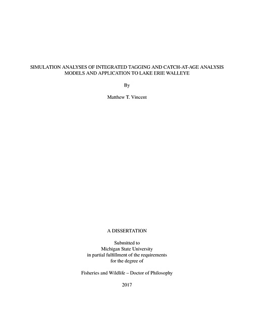 Integrated tagging and catch-at-age analysis (ITCAAN)models incorporate tag-recovery data within statistical catch-at-age models for spatially-explicit assessment of fish stocks. I investigated two tag-recovery frameworks for ITCAAN models that assumed natal homing spawning behavior: release-conditioned and recovery-conditioned. In Chapter 1, I investigated the performance of a release-conditioned ITCAANmodel under varying levels of parameter complexity, movement rates, data quality, and misspecification of natural mortality or reporting rates. The release-conditioned ITCAAN model simultaneously estimated movement rates, natural mortality, and tag reporting rates, though accuracy and precision of model estimates decreased with greater model complexity and fewer tags released. In Chapter 2, I investigated a recovery-conditioned ITCAAN model under a range of model complexities, different movement rates, misspecification of natural mortality or reporting rates, and spatially varying reporting rates. The recovery-conditioned ITCAAN model accurately estimated relative reporting rates at low intermixing rates. Biased estimates of individual population abundance resulted when intermixing was high and the reporting rate was assumed to be spatially constant, but the true reporting rates were not. I recommend recovery-conditioned ITCAAN model only be used for assessment of intermixed fish stocks when there is high certainty of spatially constant reporting rates. Both release- and recovery-conditioned ITCAAN models had difficulty estimating individual population abundances and reporting rates under high rates of movement and large differences in population sizes. For both ITCAAN frameworks, estimation of both natural mortality and reporting rates reduced the accuracy and precision of model estimates, but estimates were less biased than misspecifying one of these parameters by 50%. In all investigated simulations, parameter estimates from the release-conditioned ITCAAN model were more accurate and precise compared to the recovery-conditioned ITCAAN model. In Chapter 3, I examined the ability of a release-conditioned ITCAAN model to estimate time-varying natural mortality and reporting rate parameters and sensitivity to tag-shedding, high-reward tag-recovery data, and seasonal movement dynamics. Natural mortality and reporting rate estimates were most precise and accurate when estimated in 5-year time blocks. Estimation of natural mortality and reportingrates as temporally constant when reporting rates decreased linearly over time caused severe bias in abundance estimates, especially as the frequency of high-reward tag release events decreased. I recommend that high-reward tags be released annually to increase the precision and accuracy of ITCAAN model estimates. The release-conditioned ITCAAN model was sensitive to whether the operating model simulated tag-shedding and seasonal movement dynamics. In Chapter 4, a release-conditioned ITCAAN model was applied to Lakes Erie and Huron walleye (Sander vitreus) data and estimates were compared to current assessment models. Reasonable fits to all data sources were obtained for an ITCAAN model that estimated a single reporting rate for all recreational fisheries and assumed the effective sample size of the tag-recovery data was equal to the number of tags released divided by 10. Estimates of population abundance from the ITCAAN model were similar to the model currently used to manage Lake Huron walleye. Conversely, estimates ofabundance and natural mortality for the western/central basin of Lake Erie were lower compared to the assessment model currently used to manage the stock. Estimates of natural mortality and abundance for the eastern basin of Lake Erie from the ITCAAN model were larger than estimates for the current assessment model. Based on results from Chapters 1 and 3 the estimates of abundancefor the eastern basin of Lake Erie may be overestimated. Given the level of movement within and between Lakes Erie and Huron, ITCAAN models may be a beneficial assessment methodology for management. I recommend future tagging studies of walleye on Lakes Erie and Huron be designed such that high-reward tags and standard-reward tags be released annually so that ITCAAN modelscan provide accurate abundances, natural mortality, and reporting rates estimates. Additionally, I recommend creel surveys be conducted on the Huron-Erie corridor by the Michigan Department of Natural Resources and Ontario Ministry of Natural Resources and Forestry to measure the currently unaccounted for walleye harvest, which is likely a significant source of mortality.