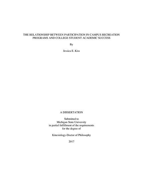 "The relationship between campus recreation and student success has been studied for decades, although consistent results have not been reported. Therefore, the purpose of this study was to determine the relationship between participation in specific campus recreation programs and college student academic success." -- Abstract.
