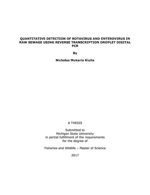 "The goal of this study was to survey the concentrations of rotaviruses (RVs) and enteroviruses (EVs) in raw sewage using reverse transcription droplet digital PCR (RT-ddPCR) and to compare the use of ViroCap filters, polyethylene glycol/sodium chloride (PEG/NaCl) precipitation and mixed cellulose ester (HA) filter methods for virus recovery." -- Abstract.