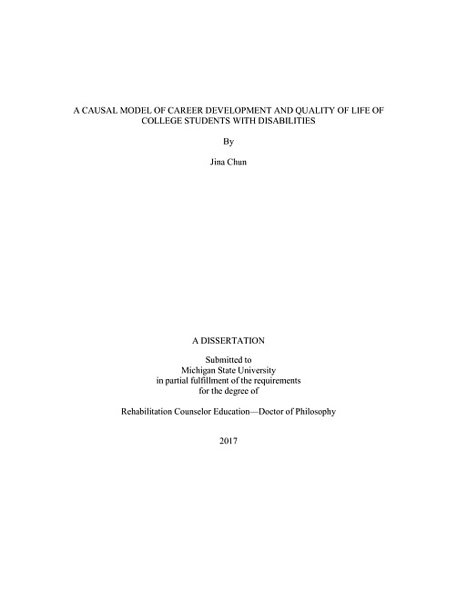 Researchers have assumed that social cognitive factors play significant roles in the career development of transition youth and young adults with disabilities and those without disabilities. However, research on the influence of the career decision-making process as a primary causal agent in one’s psychosocial outcomes such as perceived level of quality of life remains limited. Therefore, the purpose of the present study was twofold: (a) to evaluate the general compatibility (i.e., goodness of fit) of the hypothesized model with the data; and (b) to determine the effect of career decision self-efficacy, career decision-making outcome expectations, goals, and perceived contextual supports on the quality of life of college students with disabilities. Serving as a theoretical framework for the current study was Social Cognitive Career Theory (SCCT). This theory provides a lens with which to explore the predictive utility of social cognitive variables related to college students with disabilities by focusing on the strength of an individual’s beliefs, cognitive, and environmental systems.Participating in the study were 386 college students with disabilities currently enrolled in 2-year and 4-year private/public colleges and universities in a Midwestern state. They completed demographic information, career decision self-efficacy, career decision-making outcome expectations, goals, perceived contextual supports, and quality of life measures. Based on an online, quantitative descriptive survey design, a series of statistical analyses including exploratory factor analysis, confirmatory factor analysis, descriptive statistics, Pearson correlations, and structural equation modeling was used to interpret results, answer the research question and examine the hypothesis. Results showed that the structural model of career development and the quality of life of college students with disabilities adequately fit the data. They provide empirical support for the significant direct and indirect effects among the social cognitive variables and quality of life. The findings suggest that the obtained model predicts the quality of life of college students with disabilities from a combination of career decision self-efficacy, career decision-making outcome expectations, goals, and perceived contextual supports.Data generated from the present study can be used to inform current practitioners in the career development and vocational rehabilitation fields as well as college students with disabilities and their families. The findings were discussed in light of process aspects of career development and overall quality of life and strengths and limitations of the study were provided. Implications for practice and future research are also discussed.