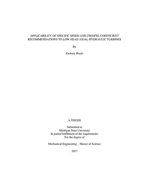 "This thesis work investigates the applicability of literature recommendations regarding specific speed and Zweifel coefficient for low head axial hydraulic turbines with constant blade thickness circular arc blade profiles, and no inlet guide vane. Highest efficiency was observed in Computational Fluid Dynamics (CFD) investigations for the designs running at speeds 12-33% that of the speed recommended by the Cordier line. Designs that followed the Zweifel coefficient recommendations of the literature in range of 0.8-1.1 demonstrated highest efficiency in CFD investigations. To test the applicability of the Cordier line recommendations for machines of this type, designs at differing specifications were tested at six different rotational speeds. Peak efficiency was measured at specific speeds between 1.4 and 1.9, compared to the Cordier-recommended value of 5.5 to 6.1. Next designs with differing values of Zweifel coefficient were simulated at the rotational speed at which highest efficiency was measured for each set of specifications. Zweifel coefficient was altered by changing the axial blade length. It was found that highest efficiency was measured at Zweifel coefficients between 0.8 and 1.1. The designs with higher axial blade lengths had lower Zweifel coefficient, and experienced greater friction losses. Decreasing blade length and increased Zweifel coefficients were correlated with more severe velocity gradients at the leading edge, increased flow deviation and areas of low pressure where cavitation could occur. Designs with the shortest blades (Zwefiel coefficient above 1.2) experienced greater velocity gradients and turbulence at the trailing edge and decreased efficiency."--Page ii.