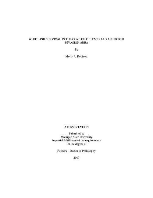 The invasive emerald ash borer (EAB); (Agrilus planipennis Fairmaire) (Coleoptera: Buprestidae), a secondary pest of stressed or declining ash (Fraxinus) trees in its native Asia, is the most destructive forest insect to ever invade North America. Since its arrival in the Detroit metropolitan area in the early 1990’s, EAB has established in 31 states and three Canadian provinces. To date, hundreds of millions of ash trees have been killed and nearly 8 billion trees are threatened in U.S. forests. While all North American ash species are susceptible to EAB, white ash (Fraxinus americana L.) appears to be an intermediate host that is not highly preferred, but still becomes infested and succumbs. Catastrophic levels of ash mortality, ranging from 80% to 99% of stems, were recorded in forested sites located in southeast Michigan and Ohio. Despite these reports, we have observed an unexpectedly high proportion of overstory white ash trees alive in southeast and south central Michigan with the longest history of EAB infestation. To quantify this survival, I intensively surveyed 28 sites in this region. I recorded 821 white ash trees ≥ 10 cm (DBH) in fixed radius plots (18 m) in a 1 ha site. Most (75%) white ash stems are alive and in good condition. More than half (68%) of the live white ash trees had external bark cracks left from previous EAB larval feeding, however, 91% of these trees recovered. In contrast, 95% of the 373 green ash (F. pennsylvanica Marsh.) trees recorded in the 28 sites are dead. This supports findings from previous plantation and urban ash tree studies reporting the preference of green ash trees over white ash trees where they co-occur. Stand-level variables that could predict the percentage of white ash stems and basal area alive were evaluated. White ash stem density and distance from sites to the EAB origin were positively related to white ash survival, while total basal area of all overstory species and white ash were negatively related to white ash survival. Density of white ash stems and distance from sites to the EAB origin were positively related to the proportion of white ash basal area alive. White ash basal area averaged 1.5 ± 0.2 m2·ha–1, and ranged from 0.3 to 3.5 m2·ha–1 within sites, totaling 42.7 m2·ha–1 across sites. I also tallied regeneration and found white ash accounted for 64%, 79%, and 74% of the total recruits, saplings, and seedlings recorded across the 28 sites. Given the impact and ongoing spread of this highly destructive pest, effective monitoring techniques are critical. I established two double decker (DD) trap types in 30 post-invasion sites located in the EAB origin in 2014, 2015, and 2016; one DD comprised of a dark green upper prism and a light purple lower prism (PG) baited with cis-3-hexanol, and one DD comprised of a dark purple prism on top and bottom (PP) baited with cis-3-hexanol and Manuka oil. A total of 580, 585, and 932 EAB adults were captured in 2014, 2015, and 2016, respectively. The PG trap captured significantly more EAB adults than the PP trap. Despite ample live white ash phloem available for EAB development, EAB density has not reached levels high enough to kill trees. In additional to stand-level variables, site variables could also have an influence on white ash survival rates. I delineated a 1.5 km radial buffer from the center point of the 28 white ash sites. Using a combination of downloaded geographic data and data collected during surveys, I fit models at five linear distances (0 to 400 m, 400 to 800 m, 800 to 1200 m, 1200 to 1500 m, and cross-scale). Green ash presence, specifically those growing along roads, had negative effects on white ash survival. The proportion of woody wetlands and the presence of white ash trees, specifically those growing along roads, were also important predictors across multiple distances.