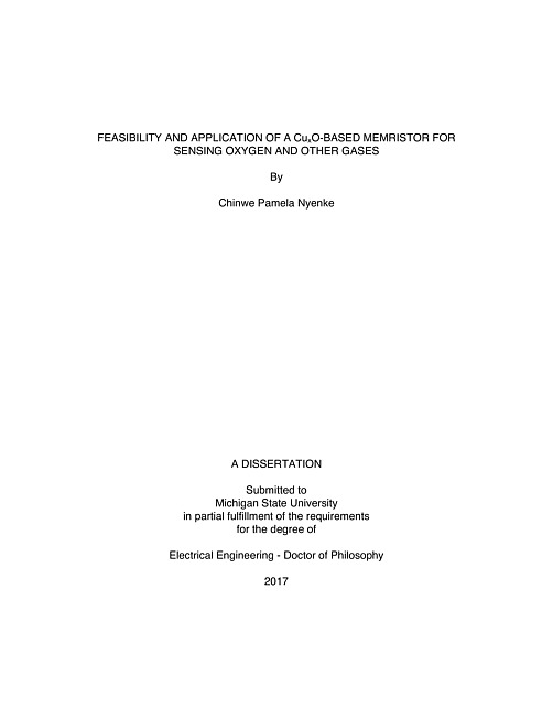 This dissertation introduces the design, fabrication, and application of acopper-oxide-based memristor for the passive sensing of oxygen and other gases.The device design was as follows: Deposition of copper (Cu) bottom electrodes,(oxygen) vacancy-rich copper oxide (CuxO) switching layers, and tungsten (W) topelectrodes in a crossbar array structure. The CuxO layer was deposited via reactivesputtering of a Cu target with an argon-oxygen (Ar/O2) mixture. A portion of thislayer was extended from each array cell to be exposed for sensing. Memristivedevices of different switching layer thicknesses were initially explored forirreversible sensing of oxygen in ambient air. Results of this first experimentdemonstrated an increase in resistance states upon prolonged exposure toambient air. For the second experiment, memristive devices were fabricated withsub-micron holes that were etched into the W top electrode to better reveal theswitching layer surface. The devices were also subjected to ambient oxygen at 180deg C to induce passive sensing in minutes. Resistance results were consistentwith the first experiment but also revealed a dependence on the surface area ofthe exposed oxide. Finally, memristive devices were investigated in a thirdexperiment for reversible sensing of an oxidizing gas and reducing gas at roomtemperature. This time, changes were not only observed in resistance but also inhysteresis (current versus voltage) depending on the type of gas introduced.Overall, this work demonstrates a step towards the use of the memristor as a gassensor, which we have named “memsensors”, by taking advantage of the device’sability to memorize (or record) historical information.