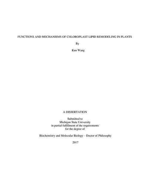Chloroplasts in plants and algae are organelles that carry out a number of important functions including photosynthesis, fatty acid biosynthesis and oxylipin mediated plant immune responses. Chloroplast membranes with a unique lipid composition are crucial for the functions of chloroplasts. Chloroplast membranes are composed of a specialized glycerolipid matrix with predominately galactolipids, mono- and digalactosyldiacylglycerol (MGDG and DGDG, respectively), and two anionic lipids, phosphatidylglycerol (PG) and sulfoquinovosyldiacylglycerol. The lipid composition of the chloroplast membranes is finely tuned in response to stresses or during various developmental stages to maintain plant fitness.SENSITIVE TO FREEZING 2 (SFR2) is a galactolipid : galactolipid galactosyltransferase that is highly conserved in land plants. In response to freezing, SFR2 is activated in freezing tolerant plants like Arabidopsis and remodels MGDG to form a class of oligogalactolipids that stabilize the bilayer structures. Phylogenetically, SFR2 is highly conserved in land plants including those that are freezing sensitive. Therefore, I hypothesized that SFR2 in freezing sensitive plants may be involved in plant resilience to other abiotic stresses, like salt or drought stresses because similar to freezing, salt and drought stress cause cell dehydration. In Chapter 2, freezing sensitive tomato was used as a model to test this hypothesis. I generated the SlSFR2 RNAi lines and observed their hypersensitivity to salt and drought responses. Decreased tolerance was correlated with compromised production of oligogalactolipids in the SlSFR2 RNAi lines, suggesting SFR2 plays a role in salt and drought tolerance in freezing sensitive plants.Maintenance of the chloroplast membranes requires a finely tuned lipid anabolic and catabolic machinery. Contrary to the chloroplast lipid biosynthetic enzymes, a large number of the predicted lipid-degrading enzymes in the chloroplasts have unknown functions. In Chapter 3, I identified over 50 chloroplast localized lipases in silico. Using a reverse genetic approach, I first focused on the characterization of an Arabidopsis thylakoid membrane-associated lipase, PLASTID LIPASE1 (PLIP1). PLIP1 is a phospholipase A1. In vivo, PLIP1 hydrolyzes polyunsaturated acyl groups from a unique chloroplast-specific PG that contains 16:1Δ3trans at the sn-2 glyceryl position. PLIP1 is predominately expressed in seeds, and the plip1 mutant seeds contain less oil while the PLIP1 overexpression seeds contain more compared to the wild type. Pulse-chase labeling assays suggest that the acyl groups released by PLIP1 are exported from the chloroplasts, reincorporated into phosphatidylcholine before ultimately entering seed triacylglycerol. Therefore, 16:1Δ3trans uniquely labels a biochemical active PG pool in developing Arabidopsis embryos, which is subject to PLIP1 mediated acyl export and seed oil biosynthesis.The Arabidopsis genome encodes two putative PLIP1 paralogs which are designated PLIP2 and 3. PLIP2 and PLIP3 are also localized in the chloroplasts, but with different subplastid locations. PLIP2 possesses similar biochemical properties in vitro to PLIP1, but in vivo studies suggest that PLIP2 prefers MGDG as substrate, while PLIP3 prefers PG. Overexpression of PLIP2 or PLIP3 severely stunts plant growth and leads to accumulation of oxylipins. Genetically blocking jasmonate signaling restored the growth of the overexpression plants. The expression of PLIP2 and PLIP3, but not PLIP1 is induced by abscisic acid (ABA), and plip1,2,3 triple mutants exhibit compromised jasmonate biosynthesis in response to ABA. Therefore, in Chapter 4, I am proposing that PLIP2 and PLIP3 are involved in linking ABA responses with jasmonate production.