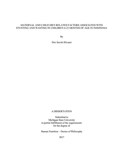 Background: Undernutrition among children under-five years of age is a long-term major concern in Indonesia. Over 20 years, the prevalence of undernutrition in this target group only decreased by 7.3% from 44.5% in 1990 to 37.2% in 2013. The most common forms of undernutrition in Indonesian young children are stunting and wasting, strong predictors of mortality and morbidity among young children. Inappropriate dietary intake is an important immediate risk factor for development of undernutrition as demonstrated in Indonesian children by a low rate of exclusive breastfeeding and poor complementary feeding, specifically relative to a high consumption of unhealthy snacks. Links between maternal and child dietary intake have been well documented, but few have examined the association of snacks with child nutrition status, which is critical for facilitating the efficacy of prevention and treatment of undernutrition among Indonesian young children.Specific aims: The two Specific Aims of this study were: 1) to examine the relationship between mother’s dietary intake quality and weight status and risk for stunting and wasting in children 6-23 months of age in Indonesia, and 2) to examine the relationship between child feeding practices, including unhealthy snack consumption, dietary quality, and risk for stunting and wasting in children 6-23 months of age in Indonesia. Methods: The Indonesia Demographic and Health Survey (IDHS) of 2010 was used to assess maternal and child diet-related factors in association with stunting and wasting in children 6-23 months of age in Indonesia. The IDHS, conducted by The Ministry of Health every three years, included a single 24-hour dietary recall and anthropometric measurements from the targeted sample. Mothers’ weight status was calculated using body mass index (BMI). Dietary quality for the mothers was determined from the 24-hour dietary recalls using the minimum dietary diversity (MDD) score recommended by FAO in 2014. Stunting and wasting were defined as height-for-age z-scores (HAZ) and weight-for-height z-scores (WHZ) lower than -2 respectively. Child dietary intake data included breastfeeding (past and current) and complementary feeding (minimum dietary diversity score and frequency of unhealthy snack consumption) practices. Path model analysis was conducted using Mplus software. Results: After data cleaning, there were 2,457 mother and child dyads. Stunting and wasting rates were 37.3% and 14.5% respectively. Mothers’ BMI had direct a positive effect on stunting (p = 0.05). There was a significant moderating effect of mothers’ MDD on child’s unhealthy snack consumption relative to wasting status, but not stunting. Risk for child stunting was for not breastfeeding (OR: 1.29, p-value < 0.05) and high consumption of unhealthy snacks (OR: 1.13, p-value < 0.05), while risk for wasting was lower with a high consumption of unhealthy snacks (OR: 0.80, p-value < 0.05). Conclusion: Not breastfeeding and a high consumption of unhealthy snacks were found as the independent factors associated with stunting in Indonesian children 6-23 months of age. High consumption of unhealthy snacks interestingly had a protective effect for wasting, while mothers’ MDD moderated the association between child high consumption of unhealthy snacks and wasting status. Therefore, findings from the current study suggest that improving breastfeeding and complementary feeding of young children can enhance their nutritional status and have short- and long-term impacts on reducing stunting and wasting.