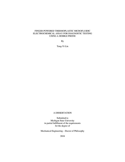 "Point-of-care (POC) testing has gained considerable attention in recent years due to its ability to provide diagnostic information without the need for centralized laboratory facilities or bulky equipment. This has been achieved, in part, by advances in micro-electro-mechanical system (MEMS) and analytical chemistry, which has resulted in the miniaturization and integration of sensitive biosensors and fluidic components. Recently, researchers have demonstrated the use of mobile phones for POC testing, which offers the advantages of portability and wireless data transmission. Many mobile phone-based POC tests are based on optical imaging or colorimetric assays, which are useful for some diagnostic applications, but lack the accuracy and sensitivity required for the diagnosis of many important diseases. Moreover, these devices employ microfluidic chips fabricated using glass, polydimethylsiloxane (PDMS) or paper, which require complex microfabrication or surface treatments, or offer limited fluidic control. In this dissertation, we explored the development of plastic-based microfluidic chips for rapid electrochemical measurements of protein biomarkers using a mobile phone biosensing platform. We first investigated UV/ozone (UVO) surface treatment on plastics to better understand its usefulness for microfluidic POC applications. We found that UVO-treated poly(methyl methacrylate) (PMMA), cyclic olefin copolymer (COC) and polycarbonate (PC) experience hydrophobic recovery within 4 weeks and the rate at which it occurs is dependent on the UVO treatment duration. Furthermore, we discovered that the hydrophobic recovery of UVO-treated COC and PC can be inhibited by storing them in dehumidified or vacuum conditions. UVO-treated plastics were also used for protein adsorption measurements, which showed that UVO treatment minimized protein adsorption and this effect is correlated with the treatment duration. Lastly, we demonstrated capillary-driven flows in UVO-treated PMMA microchannels, which revealed that the flow rate can be tuned by adjusting the treatment duration. We also explored the development of new fabrication methods for generating plastic microfluidic devices. In particular, we have demonstrated for the first time the use of 3D printed metal molds for fabricating plastic microchannels via hot embossing. Through the optimization of the powder composition and processing parameters, we generated stainless steel molds with superior material properties (density and surface finish) and replication accuracy compared with previously reported 3D printed metal parts. 3D printed molds were used to fabricate PMMA replicas, which exhibited good feature integrity and replication quality. Microchannels fabricated using these replicas exhibited leak-free operation and comparable flow performance as microchannels fabricated from CNC milled molds for both capillary and pressure-driven flows. Toward the realization of a shelf stable, electricity-free microfluidic assay for POC testing, we developed a finger-powered microfluidic chip for electrochemical measurements of protein biomarkers. This device employs a valveless, piston-based pumping mechanism which utilizes a human finger for the actuation force. Liquids are driven inside microchannels by pressing on a mechanical piston, which generates a pressure-driven flow. Dried reagents are preloaded in microwells allowing for the entire testing process to be completed on-chip. Additionally, a nonenzymatic detection scheme is employed which circumvents the need for refrigeration. For proof-of-concept, this microfluidic assay was coupled with a mobile phone biosensing platform for quantitative measurements of Plasmodium falciparum histidine-rich protein-2 (PfHRP2) in human blood samples. Using this platform, PfHRP2 was detected from 1 to 20 æg/mL with high specificity and each measurement could be completed in 2264 5 min. In addition, this assay can be stored at room temperature for up to one month with a negligible loss in performance. The results and knowledge presented in this dissertation will provide new insights into the development of plastic microfluidic devices for POC testing as well as other biomedical application."--Pages ii-iii.