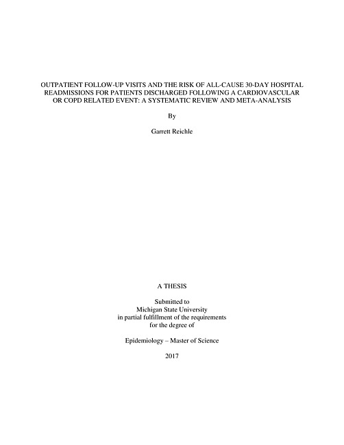 Hospital readmissions are important as they are costly, are associated with high mortality, morbidity and an increased risk of long-term care, and are important as readmissions are now included in Pay-for-Performance (P4P) programs (1-3). One potential mechanism to reduce readmission is through outpatient follow-up visits with a physician after initial discharge (4). This review seeks to understand the effect outpatient follow-up visits have on all-cause 30-day readmissions for patients with an initial discharge of Acute Myocardial Infarction (AMI), heart failure, Chronic Obstructive Pulmonary Disease (COPD) or an acute stroke event. We conducted a systematic review and meta-analysis of observational studies, searching the PubMed and CINAHL databases. The search consisted of articles published in the United States over a 10 year period 2007 through 2017. We calculated relative risk (RR) and 95% confidence intervals for each outcome and assessed heterogeneity using the I2 and Q-statistics. From 573 hits, we identified 10 eligible studies. The pooled RR from the six patient-level studies found that outpatient follow-up visits reduced the risk of readmission by 13% (RR= 0.87; 95% CI 0.77-0.97, p= 0.014). However, the I2 statistic was 65.5% and the Q-statistic p-value was 0.05, indicating that there is a moderate to substantial amount of heterogeneity. Hospital-level studies were not included in the analysis. Although some evidence exists for the benefit of outpatient follow-up visits with a physician, additional evidence is needed in order to quantify the impact of outpatient follow-up visits to reduce 30-day readmissions. -- Abstract.