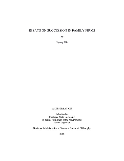 "This dissertation is composed of three essays related to the succession in family firms. The first essay documents a novel channel of transfer of control in family firms. I provide evidence, from a natural experiment, that avoiding inheritance tax is the motivation behind intra-group mergers. Due to tax reform that increases personal inheritance taxes by 25 percentage points, the firms burdened by a high personal inheritance tax are most likely to increase intra-group merger activities during post tax-reform period. This result suggests that firms with heavy inheritance tax burdens acquire smaller affiliates owned by the heirs. This way, heirs convert target shares to acquirer shares while avoiding inheritance tax. In my second essay, I identify succession as a novel determinant of risk-taking in family firms. I find significantly higher risk-taking (M&A and cash flow volatility) and lower operating efficiency in firms controlled by families with multiple sons during the pre- rather than the post-succession period compared to family firms with one or no sons. Pre-succession risk-taking by sons decreased after the instatement of inheritance legislation that required some sharing of wealth between them. An infusion of outside talent via daughters' marriages also alleviates sons' relative rank-seeking behaviors during succession tournaments. The third essay documents an unusual surge in fraud investigations for family firms with many sons prior to leadership successions, which are accompanied by negative shareholder reactions. Such fraud investigations are concentrated in firms run by families with extensive internal conflicts, including public feuds, as well as families with half-brothers. Using the sudden death of a chairman as an exogenous shock that increases conflicts inside the family, we find sharply increasing fraud investigations following the chair's death. Overall, our results shed new light on the significant spillover from family governance to corporate governance in family-run organizations."--Pages ii-iii.