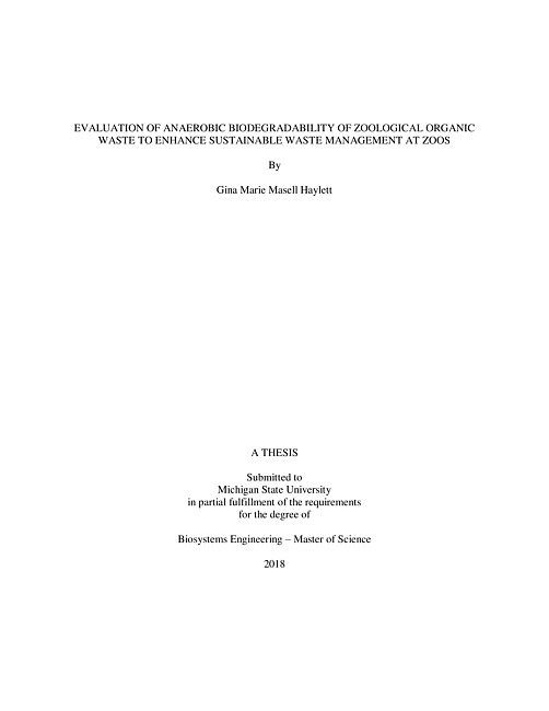 "Zoos across the country are pushing for sustainable solutions to mitigate their high-energy consumption and provide organic waste management. Anaerobic digestion provides an alternative to traditional waste management solutions such as landfilling, incineration, and composting. The Detroit Zoological Society (DZS) was selected as the zoo for this study. This study analyzed seven waste samples and mixtures from the DZS. A biochemical methane potential (BMP) test was performed on these wastes and their mixtures to determine the energy content. The results show that all samples are anaerobically biodegradable with samples yielding 501, 622, 269, 117, 232, 653, and 302 L biogas per kg initial VS for carnivore, primate, hoofstock mix, bird mix, zoo mix, food waste, and ZMF, respectively. The energy balance and carbon footprint analyses on BMP data further conclude that anaerobic digestion can efficiently handle zoo wastes, generate renewable energy to compensate 1.4% of the zoo's energy demand for their animal operations, as well as reduce carbon dioxide emission by 16%. In addition, the zoo mix and ZMF samples were tested in small-scale pilot digesters. Results show that the zoo mix sample yielded the highest cumulative gas production while the ZMF sample indicated inhibition due to low operating pH. The zoo mix and ZMF samples were fit to the Modified Gompertz Equation model to determine performance parameters for scale-up considerations."--Page ii.