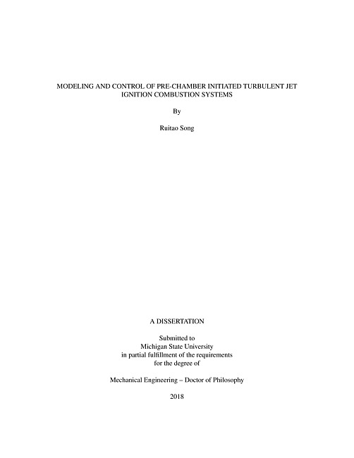 "Turbulent jet ignition (TJI) combustion is a promising concept for achieving high thermal efficiency and low NOx (nitrogen oxides) emissions. A control-oriented TJI combustion model with satisfactory accuracy and low computational effort is usually a necessity for optimizing the TJI combustion system and developing the associated model-based TJI control strategies. A control-oriented TJI combustion model was first developed for a rapid compression machine (RCM) configured for TJI combustion. A one-zone gas exchange model is developed to simulate the gas exchange process in both pre- and main-combustion chambers. The combustion process is modeled by a two-zone combustion model, where the ratio of the burned and unburned gases flowing between the two combustion chambers is variable. To simulate the influence of the turbulent jets to the rate of combustion in the main-combustion chamber, a new parameter-varying Wiebe function is proposed and used for mass fraction burned (MFB) calculation in the main-combustion chamber. The developed model is calibrated using the Least-Squares fitting and optimization procedure. The RCM model was then extended to a TJI engine model. The combustion process is modeled by a similar two-zone combustion model based on the newly proposed parameter-varying Wiebe function. The gas exchange process is simulated by one-zone model considering piston movement and intake and exhaust processes. Since the engine uses liquid fuel, a pre-chamber air-fuel mixing and vaporization model is developed. And correspondingly, the pre-chamber uses a chemical kinetics based model for combustion rate calculation. The model was validated using the experimental data from a single cylinder TJI engine under different operational conditions, and the simulation results show a good agreement with the experimental data. For control design, a nonlinear state-space engine model with cycle-to-cycle dynamics is developed based on the previous crank-angle-resolved (CAR) TJI engine model. The state-space model successfully linked the combustion processes in the two chambers using the parameter-varying Wiebe function. The validated CAR model is used to calibrate and validate the state-space engine model. The simulation results of the two engine models show a good agreement with each other. Thereafter, a linear-quadratic tracking controller is developed for combustion phasing control. Simulation results are presented and a baseline controller has been implemented on the research engine. Combustion phasing control is very important for internal combustion engines to achieve high thermal efficiency with low engine-out emissions. Traditional open-loop map-based control becomes less favorable in terms of calibration effort, robustness to engine aging, and especially control accuracy for TJI engines due to the increased number of control variables over conventional spark-ignition engines. In this research, a model-based feedforward controller is developed for the TJI engine, and a feedback controller is also designed based on the linear quadratic tracking control with output covariance constraint. Since the TJI main-chamber combustion is influenced by the pre-chamber one, the proposed controller optimizes the control variables in both combustion chambers. The proposed feedforward and feedback controllers show significant performance improvement over a group of baseline controllers through a series of dynamometer engine tests."--Pages ii-iii.