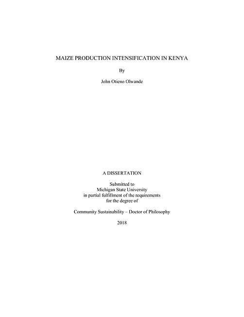 Soil infertility is one of the major problems contributing to low and stagnated agricultural productivity in sub-Saharan Africa. In Kenya, this problem is manifested in maize where yields have remained low and stagnated over time despite increased use of inorganic fertilizers and improved seed varieties. More effective alternatives and/or complimentary actions to address this problem thus remains germane. This dissertation contributes to that endeavor through two broad objectives: to generate evidence that can support decisions to address the problem of low agricultural productivity in general and of maize in particular in Kenya; and to contribute to the body of knowledge about agricultural intensification in sub-Saharan Africa.The first essay uses household panel survey data from rural Kenya covering a period of 13 years (1997 – 2010) to examine trends and patterns in land and labor productivity of maize, measured as net returns to land and to family labor. Results show declining landholdings and farm sizes but maize occupied over one-half of cultivated land. Land productivity declined by 42% for households with at least 10 acres and by 33% in the most important maize producing regions. Labor productivity increased in areas with smaller landholdings and higher population density because of increase in land productivity, and declined or only marginally increased in areas with larger landholdings and lower population density because of a decline in land productivity. These results demonstrate that increasing maize production and returns to family labor in Kenya will rely on improving yields especially in the major maize growing areas where this has declined.The second essay uses data on maize production in five major maize growing counties in Kenya to compare maize farmers’ perceived soil fertility to measured soil fertility. It also investigates the influence of farmers’ perceptions of soil fertility on their adoption (use) of soil fertility management practices. Results show little agreement between farmers’ perceived and measured soil fertility, and farmers mostly judge the fertility status of soil by crop performance. Farmers apply management practices that may not match the fertility needs of soil on their plots, exemplified by the persistent application of an acidifying fertilizer (diammonium phosphate (DAP)) and low application of organic soil amendments even on plots with soils that are acidic and deficient in organic carbon. Farmers on average are more likely to apply inorganic fertilizer to plots they perceive to be infertile, and they treat manure or compost and inorganic fertilizers as serving substitute roles in soil fertility. These results suggest policy and extension information gaps regarding soil fertility management.The third essay uses the same dataset as in the second essay together with rainfall data to estimate technical efficiency of maize farmers and the effect of farmers’ soil fertility perception on technical efficiency. It also demonstrates the importance of including environmental production conditions and agronomic practices in agricultural productivity and efficiency analysis. Average technical efficiency level is 0.75 and 0.70, respectively, with and without environmental variables and agronomic practices in the model, indicating that scope for increasing maize yield through better management of inputs exits and that omission of environmental variables and agronomic practices underestimates technical efficiency. Farmers’ perception of soil fertility and the consistency of their perception with measured soil fertility both have significant effects on technical efficiency, underscoring the importance of information that can enhance farmers’ accurate understanding about soil fertility conditions on their farms to help them make better production decisions.