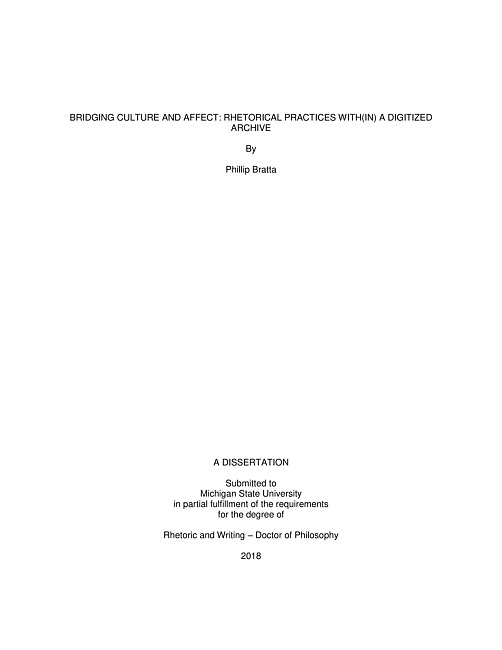 Bridging Culture and Affect: Rhetorical Practices with(in) a Digitized Archive offers a theoretical framework to understanding culture and affect in both digital and non-digital engagement. Many scholars typically take a semiotic approach to understand and interpret cultural texts and events. They, however, often neglect the importance of affect in cultural production, consumption, and meaning. In affect theory, many theorists argue that affect is an ineffable, non-representational, and acultural phenomenon. Yet these theorists fail to account for the role of cultural meanings that produce affect. As such, I argue that rhetorical thinking and practice can activate what I call cultural affect—a rhetorical event in which one’s lived, embodied experiences emerge through intensities that orient a set of relations and meanings. As a practice, then, cultural affect involves not merely reading and then writing about people, texts, objects, and things, but attending to one’s cultural background and affective experience during research and analyses.To show cultural affect in action, I use a mixed-methods approach—story, interviews, and multi-sensuous rhetorical analyses—to explore a set of labor union political posters in the Joseph A. Labadie Special Collections archive at the University of Michigan. After discussing the digitized versions of the posters, I examine three posters created by the labor union Industrial Workers of the World. My findings show the relationships between embodiment, texts, and language. More specifically, they bring to the surface the labor of writing and the practice of connecting reflections and cultural histories. The findings push us to make tighter connections between embodiment and language, emphasize the value in multimodality and diverse writing styles, initiate ethical practices, and identify the affordances and limitations of digitizing texts.